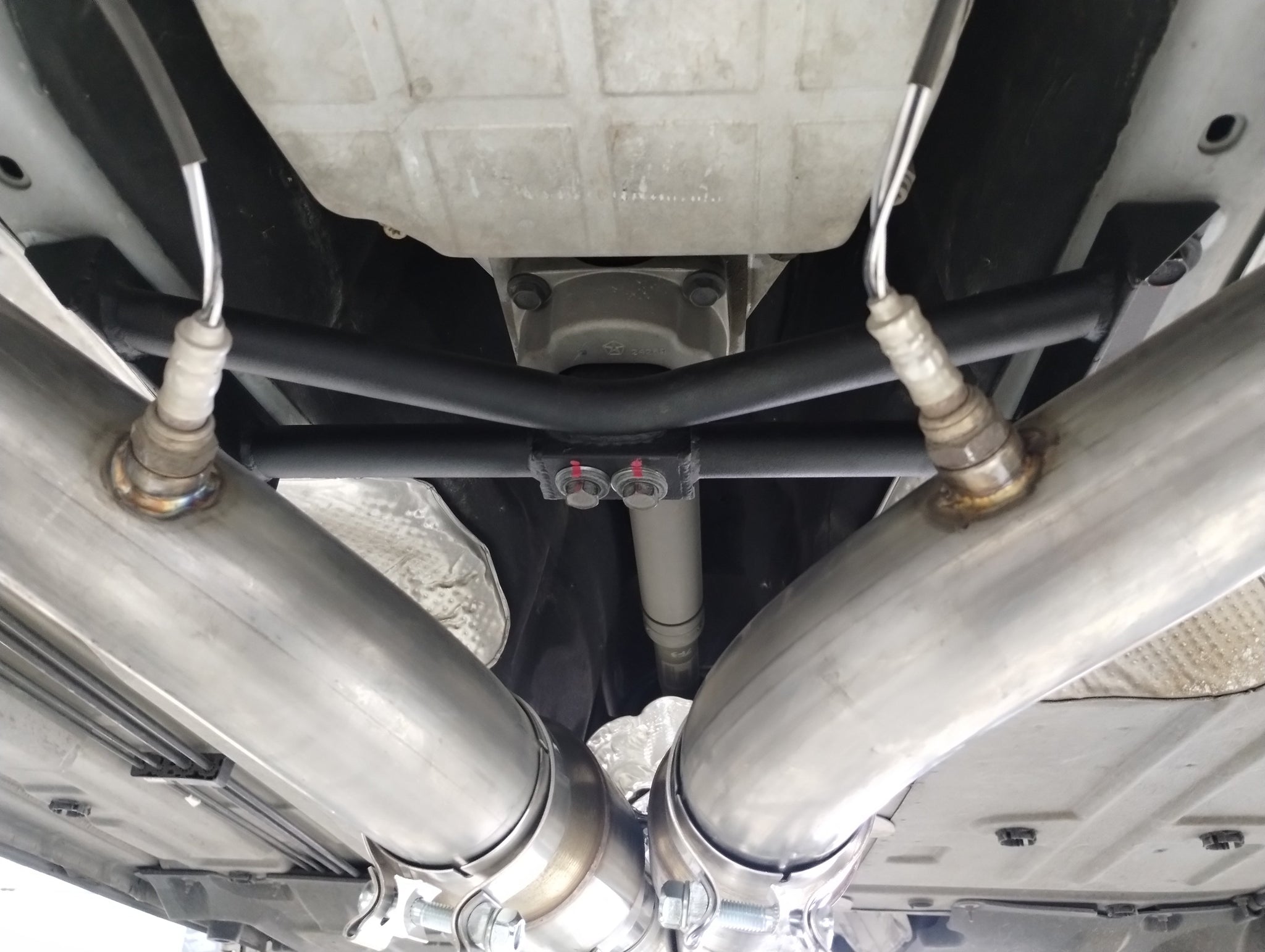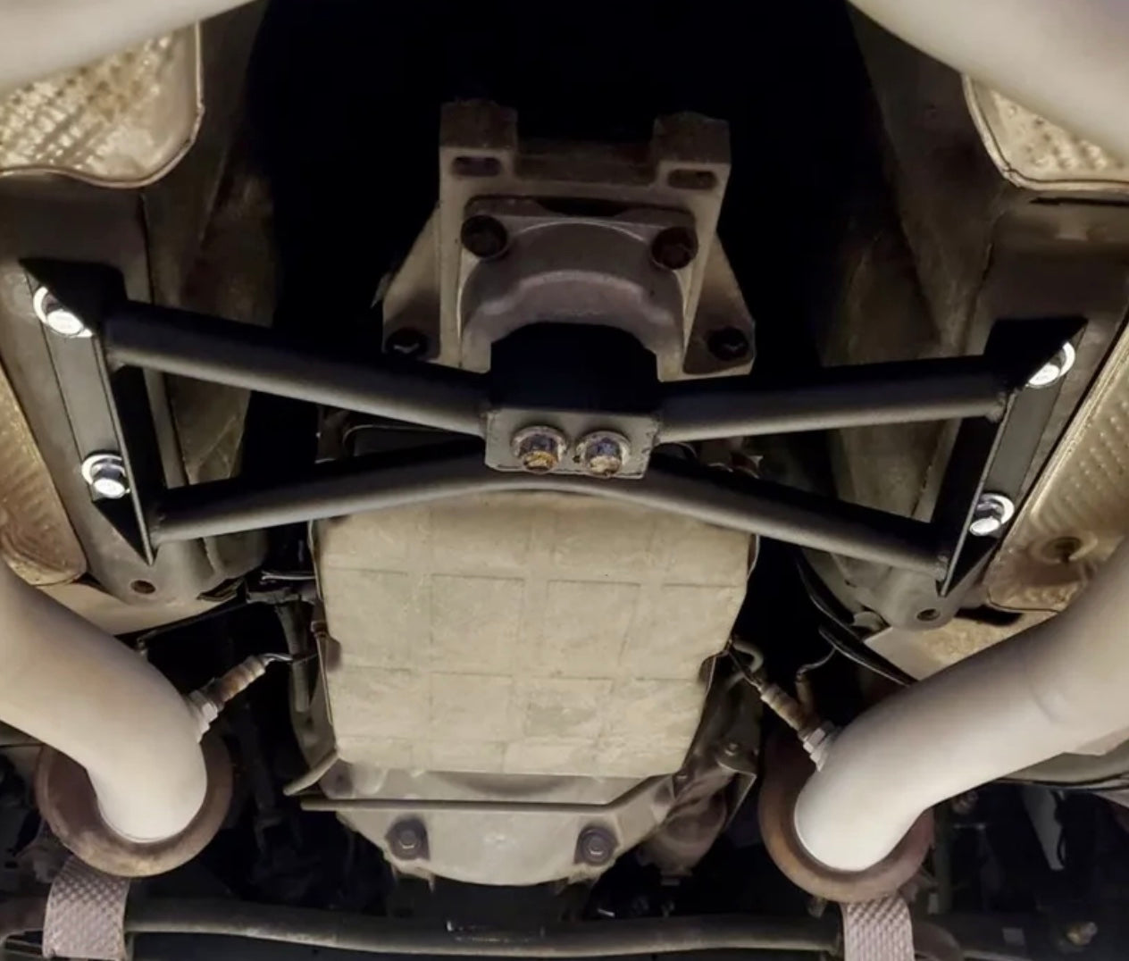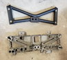 Automatic transmission crossmember. It is built with 4130 chro-moly tubing. We use multiple tubes in a triangulated design making for a much more rigid part. By incorporating chro-moly we are able to build a stronger, more rigid part and still be 3 lbs lighter than stock.