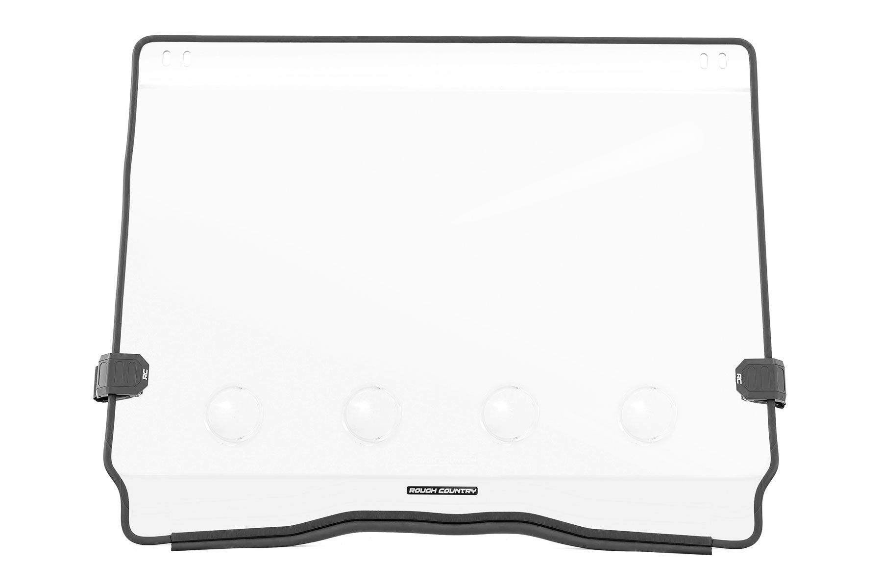Added Protection and comfortability. Protect the occupants of your Polaris RZR Pro R from off-road hazards such as rocks, branches, and other debris with Rough Country's Scratch-Resistant Windshields. UTV Windshields offer a clear visual of the trail ahead and allow for a much more comfortable outing!\High-Quality Polycarbonate Construction. Rough Country UTV windshields are constructed from thick polycarbonate material that is precision cut for a perfect fit. The polycarbonate material provides an ideal combination of clarity, flexibility, durability that outperforms glass, acrylic, and other windshield materials.\Durable Scratch and UV Resistance. Each windshield is not only constructed from thick polycarbonate material but enhanced by a secondary AR2 hard-coating process. This process completely coats the windshield with a hardened, scratch-resistant barrier. This treatment also provides the additional benefit of UV protection.\Easy Installation. With a simple strap-on installation process, installing a Rough Country windshield couldn't be easier. Within 15 ΓÇô 30 mins you can be ready to hit the trails.\Limited-Lifetime Replacement Warranty. Rough Country's Scratch-Resistant Windshields are backed with a limited lifetime replacement warranty towards manufacturer defects. As such, the product is protected from structural and workmanship damage after the date of purchase. With our industry-leading warranty give yourself peace of mind when using Rough Country's Suspension products!