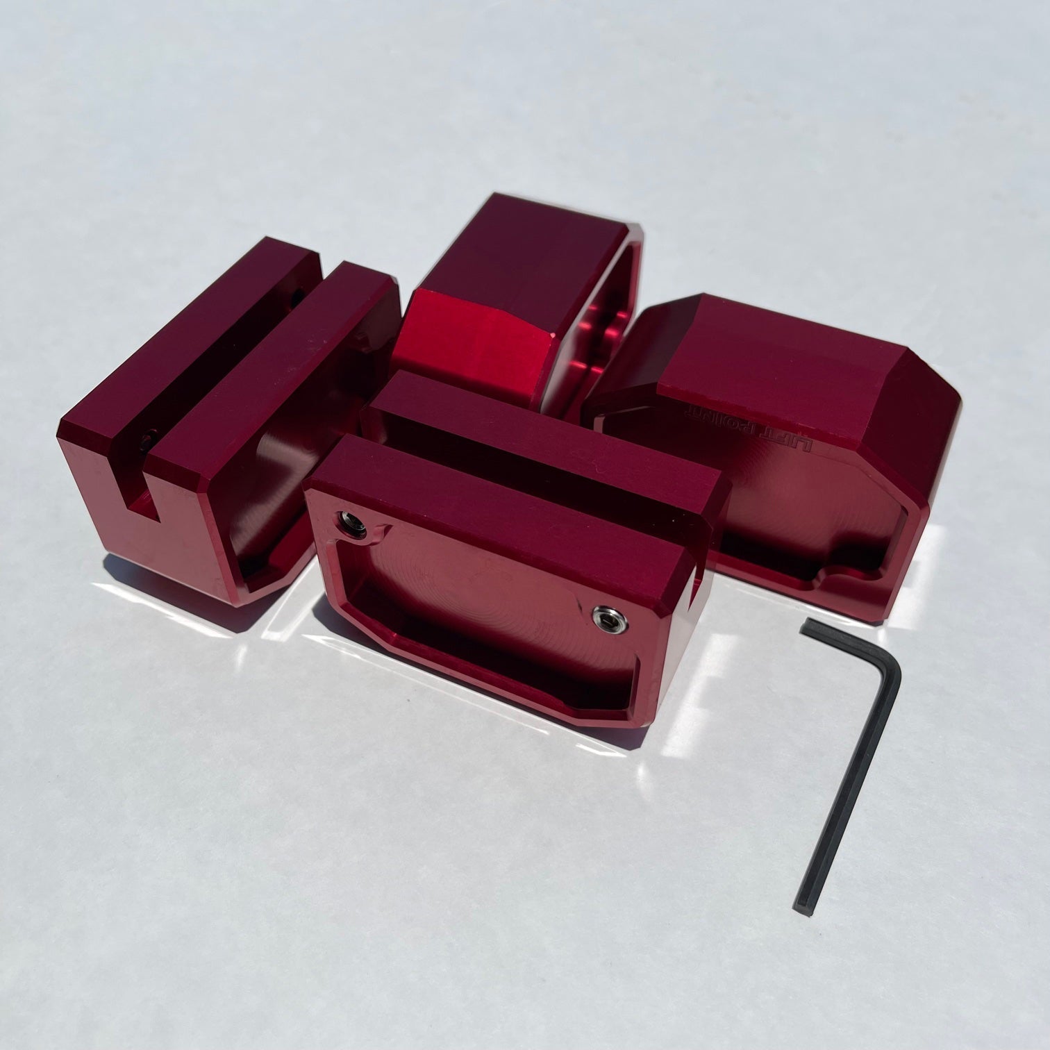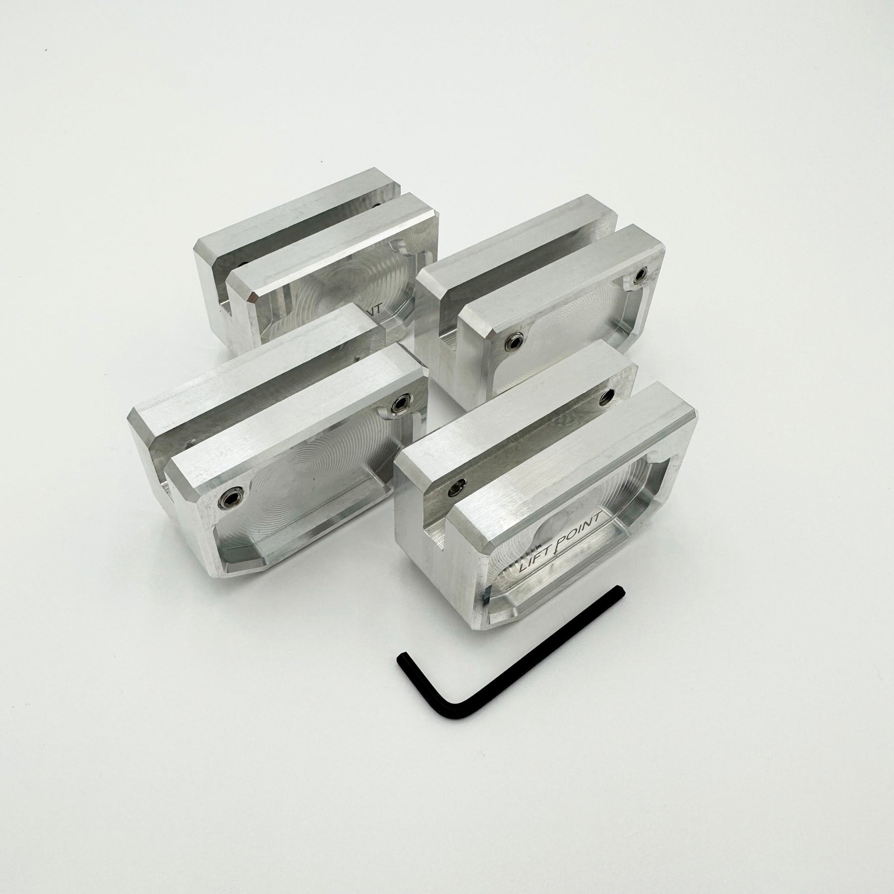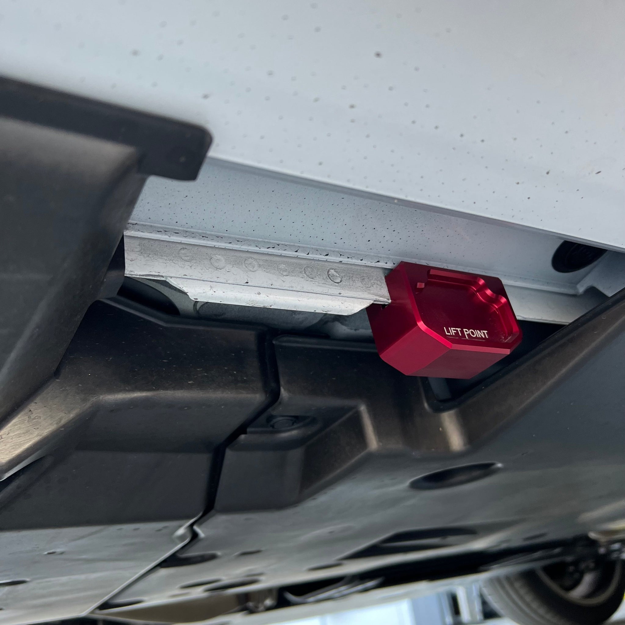 The original bolt-on lift points made in the USA for the 2022-2024 Corolla GR. Machined from American billet aluminum and designed to be left on the car. The stealth design also incorporates weight savings and a custom design to catch the attention of the mechanic or shop preparing to lift your vehicle.  These are angled as to not bend the pinch weld as the car is lifted by a floor jack or lift.