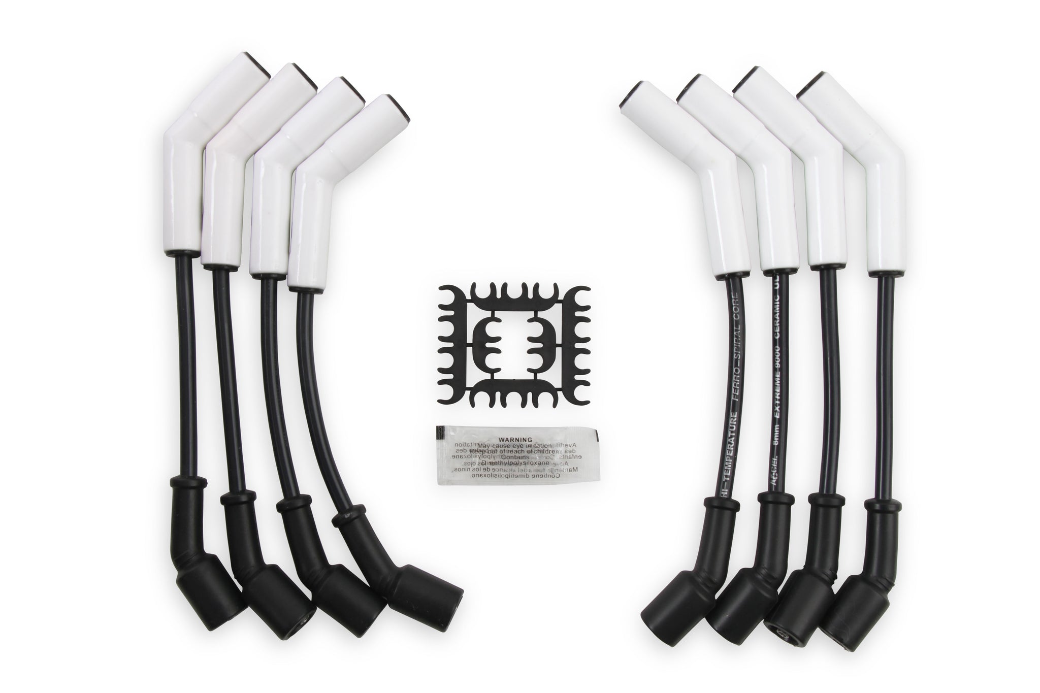 ACCEL now offers the cure for burnt spark plug wire boots with Extreme 9000 Ceramic Wire kits. The 8mm Ferro-Spiral core wire now has ceramic boots on the spark plug end of the wires. The ceramic boots will withstand up to 2,000 degrees F. If you are running headers with close tolerances, have an engine bay with little room or an RV with boots that melt because of heat, these wire kits are the answer for burnt and melting boots. The wire uses a 500 Ohms/ft Ferro-Spiral core developed for performance use. It provides excellent energy delivery to the spark plugs, while providing the highest level of RFI/EMI suppression. The Extreme 9000 Ceramic Wires also feature stainless steel spark plug terminals for maximum spark energy to the plugs.