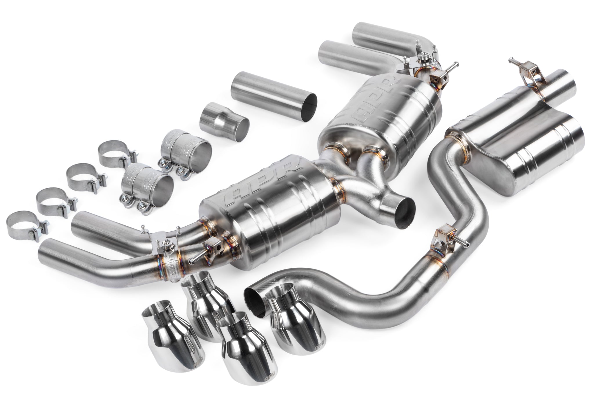 The APR Catback Exhaust System personalizes your vehicle's looks, sound and performance. Beautifully hand-crafted T304-stainless-steel components adorn the system with stunning TIG-welding throughout. Our straight-through brushed-finished mufflers smooth the exhaust note to a deep growl, without adding restrictions, while our Helmholtz resonator reduces unwanted frequencies. Strong high-quality bracketry and OEM-style clamps hold the system steadily in place, making the install or removal a snap, and fitment simple, yet precise. A cast 3" to quad 2.5" rear splitter creates an ultra-smooth transition, steadily feeding exhaust gasses out of the system, while looking tidy from under the rear bumper. Our cast valve housings enable the vehicle to be fitted with the factory electronic valve actuators, retaining OEM valve operation.  Finally, removable 4" polished slash-cut exhaust tips finish the system, adding a classy motorsport-inspired touch to the rear of the vehicle.