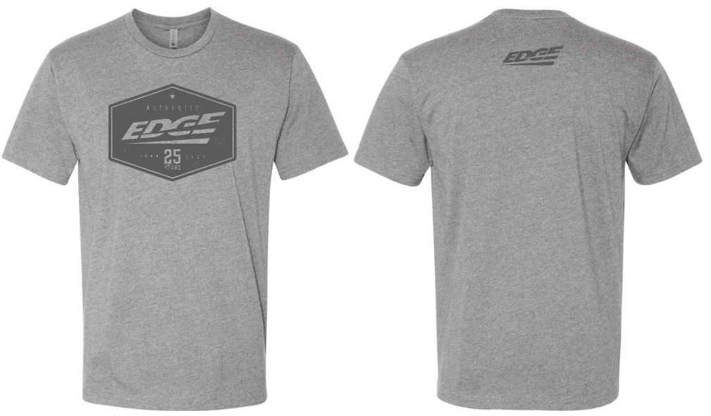 Celebrate 25 years of diesel innovation with Edge in style! Our premium Next Level grey t-shirt combines comfort and performance, just like our cutting-edge tuning solutions. Crafted from a soft and breathable cotton-poly blend, it offers a modern athletic fit, perfect for the shop, lounging on the couch, or cruising the streets.
