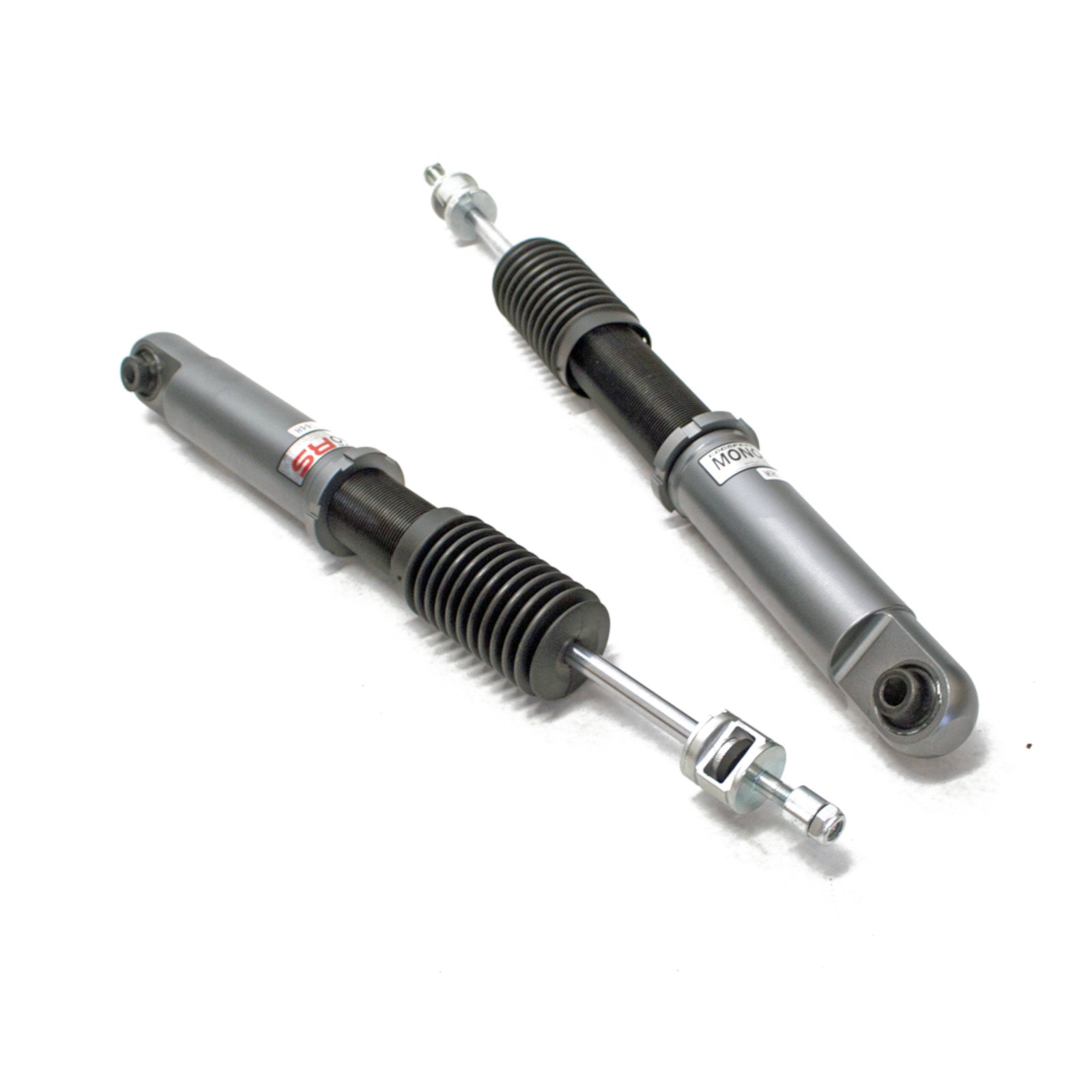 MonoRS Coilover damper kit by Godspeed Project are an intermediate suspension upgrade setup for daily and Sunday club racing. Lowering your car with improved springs over factory and paired with Monotube shocks with valving that allows 32 levels of rebound adjustment to improve handling without sacrifice comfort. Ride height can easily be adjusted by twisting the lower mount bracket. In order to keep weight gain at the minimum, most of attachments and accessories are CNC machined from billet aluminum. Koyo bearings are used when camber plate top mount is applicable depends on car models. To assure that our customers are getting high quality products, MonoRS coilovers are covered by 12 months limited warranty by the manufacturer from top to bottom just like other big brand name setups.