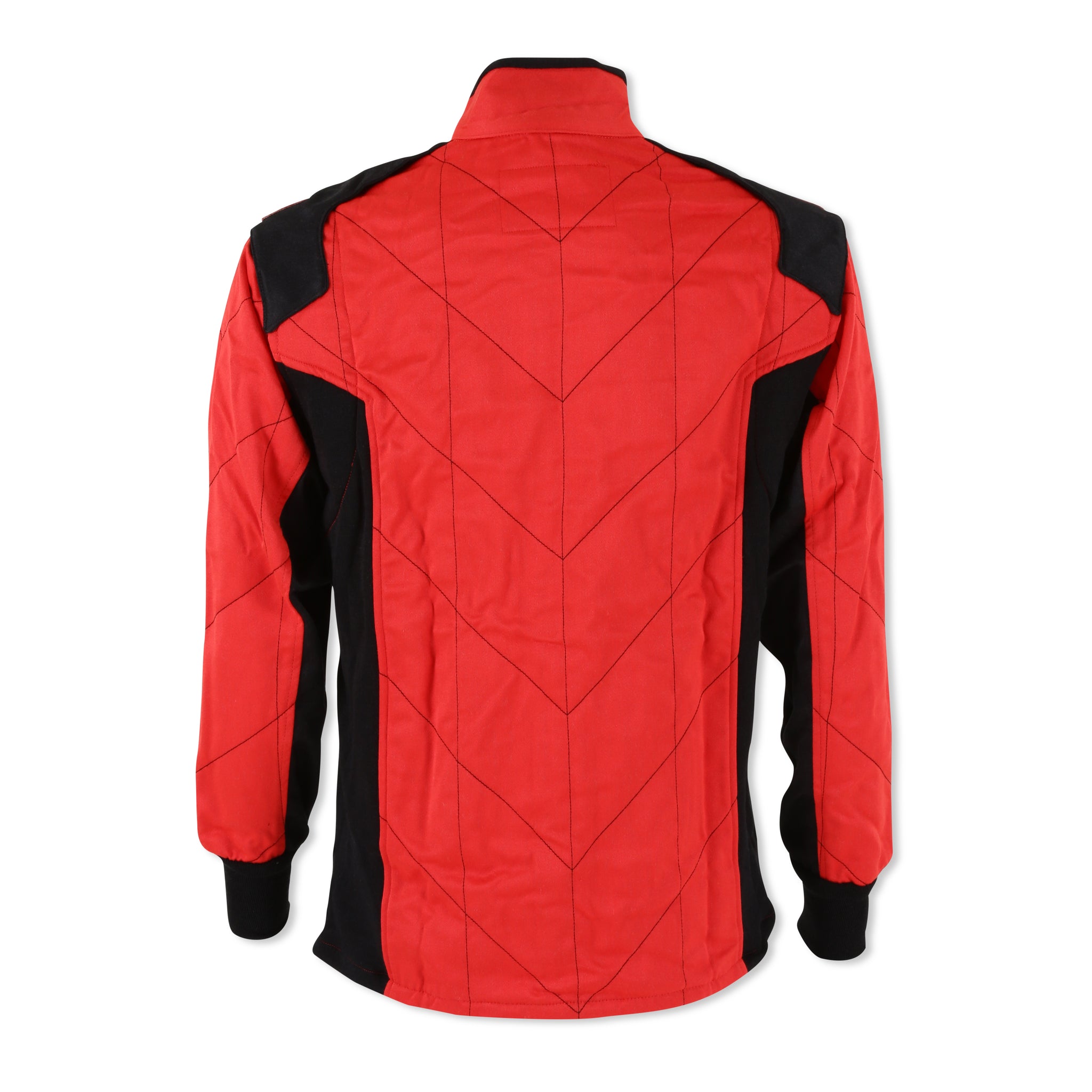 The RaceQuip 9161 series Chevron-5 multi-layer SFI-5 racecar driver's fire suit jacket is made up of an outer layer of durable Nomex® and a soft, comfortable and lightweight Nomex® liner with Chevron pattern box quilting. The stylish modern Euro design is accentuated with black trim Euro epaulets, black side panels, and black Nomex cuffs. The side panels feature knit stretch fabric for flexibility in the torso and the 180° floating arm gussets increase flexibility in the arms. The Chevron-5 jackets feature a high quality, heavy duty Nomex® backed brass, two-way zipper installed with a double overlap for a more secure front opening. Exceeds SFI 3.2A/5 specs. Available in Black, Red or Blue with Black accents. Manufactured in sizes Small - 3X-Large (refer to sizing chart). Note that sometimes these materials are referred to as "fireproof", but actually all auto racing safety gear is "fire retardant".