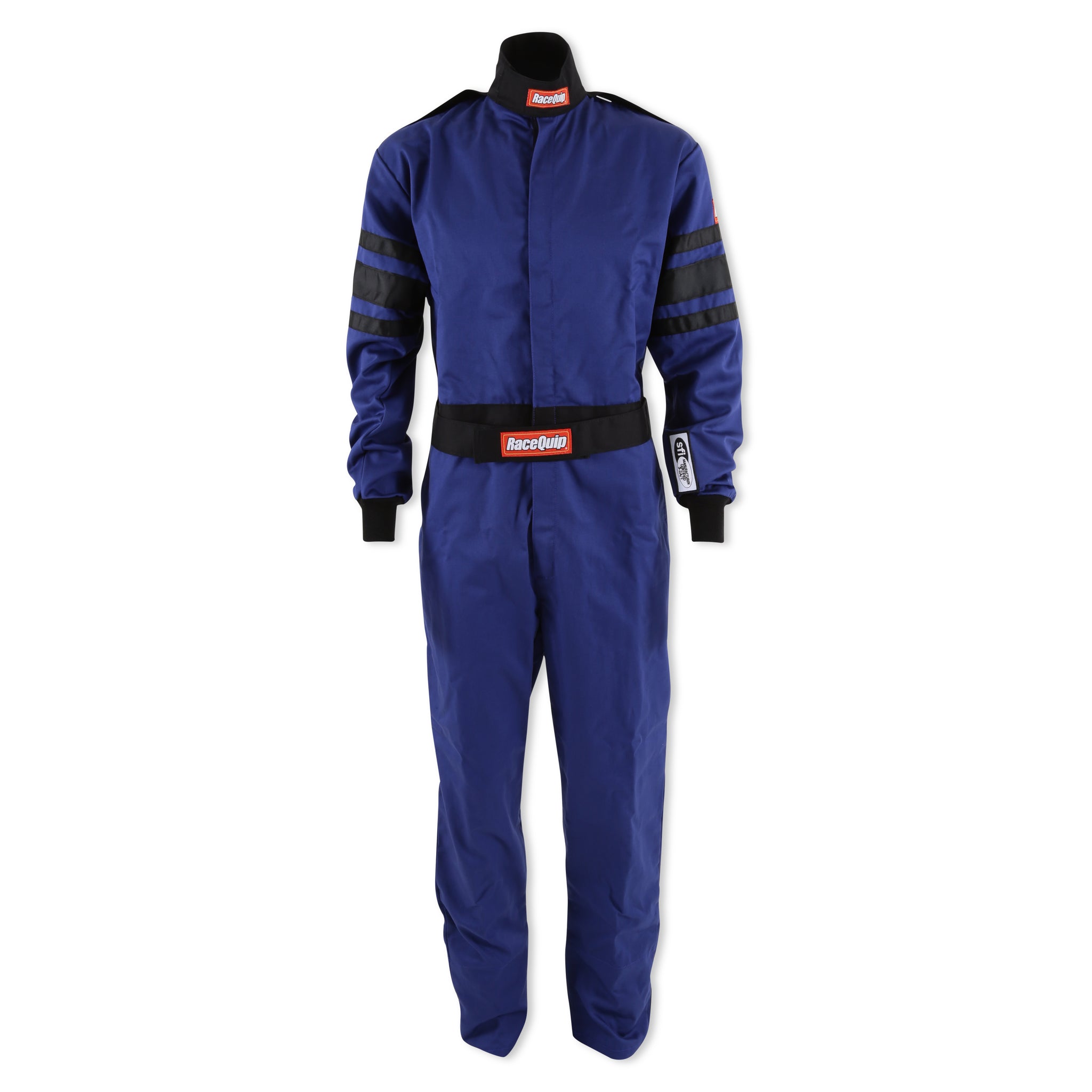 The RaceQuip 120 series multi-layer SFI-5 racecar driver's fire suit is made up of an outer layer of durable Pyrovatex® FRC, backed by a layer of Nomex®, then lined by another layer of Pyrovatex®. Note that sometimes these materials are referred to as "fireproof", but all auto racing safety gear is "fire retardant". Pyrovatex® offers the maximum combination of overall flame and heat protection, durability and comfort for the price. This fire-retardant cotton based (FRC) material is used for the inner and outer layers because it retains the softness and breathability of cotton and will wick away moisture from the skin. Pyrovatex® fabric is gentle and non-irritating to even the most sensitive skin. The treatment process leaves the exterior surface shiny and supple. Since the Pyrovatex® process combines a chemical agent with the raw cotton fibers to create a bond at the molecular level, with proper care; the suit will retain its flame-retardant properties beyond the useful life of the garment. The middle layer consists of Nomex(R) batting which is an inherently fire-retardant aramid fabric. All racing suits are assembled with heavy-duty, multi-needle, over-lock safety stitch machines to provide exceptional seam strength.