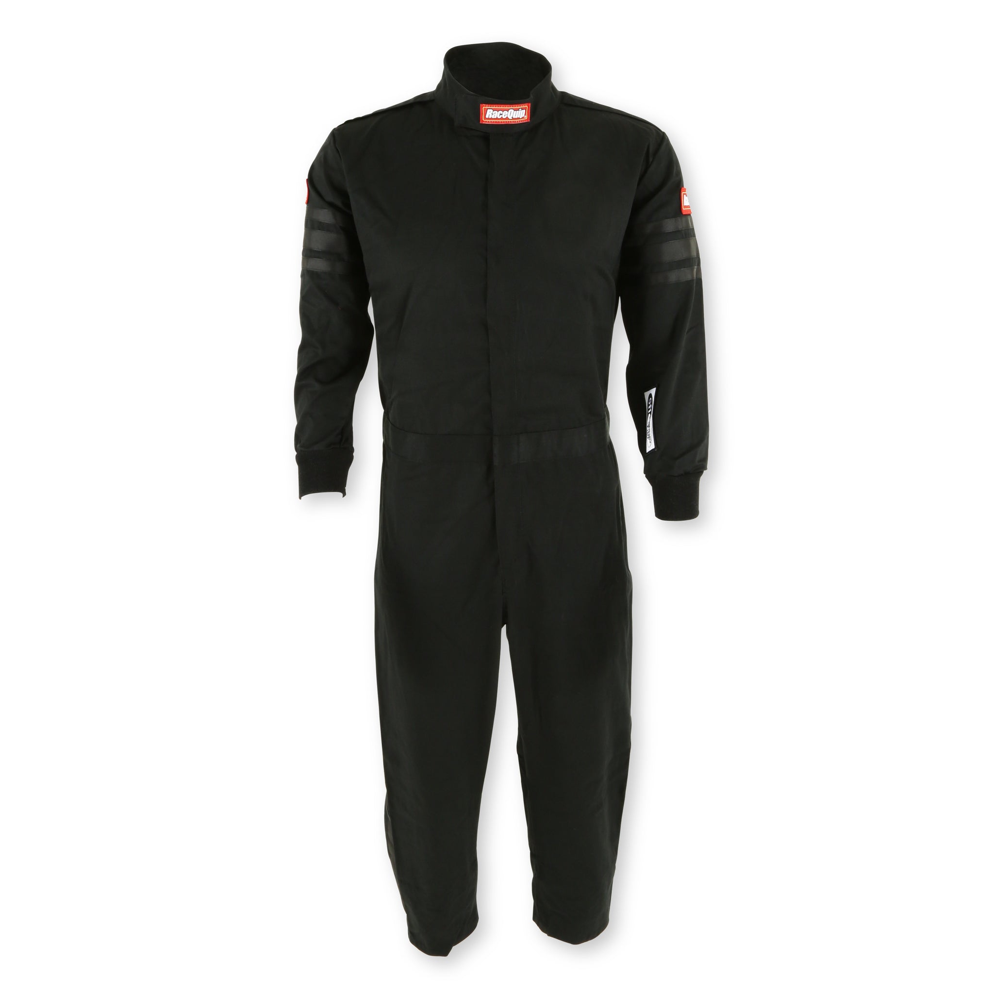 The RaceQuip Youth single-layer SFI-1 racing suit is made from Pyrovatex® FRC material. Note that sometimes these suits are referred to as "fireproof" racecar driver's suits, but actually all auto racing safety gear is "fire retardant". Pyrovatex® offers the maximum combination of overall flame and heat protection, durability and comfort for the price. This fire-retardant cotton based (FRC) material is used because it retains the softness and breathability of cotton and will wick away moisture from the skin. Pyrovatex® fabric is gentle and non-irritating to even the most sensitive skin. The treatment process leaves the exterior surface shiny and supple. Since the Pyrovatex® process combines a chemical agent with the raw cotton fibers to create a bond at the molecular level, with proper care, the suit will retain its flame-retardant properties beyond the useful life of the garment. All racing suits are assembled with heavy-duty, multi-needle, over-lock safety stitch machines to provide exceptional seam strength. RaceQuip suits feature a high-quality heavy duty Nomex® backed brass zipper installed with a double overlap for a more secure front opening. Stylish contrasting armband stripes match the full-length leg stripes.