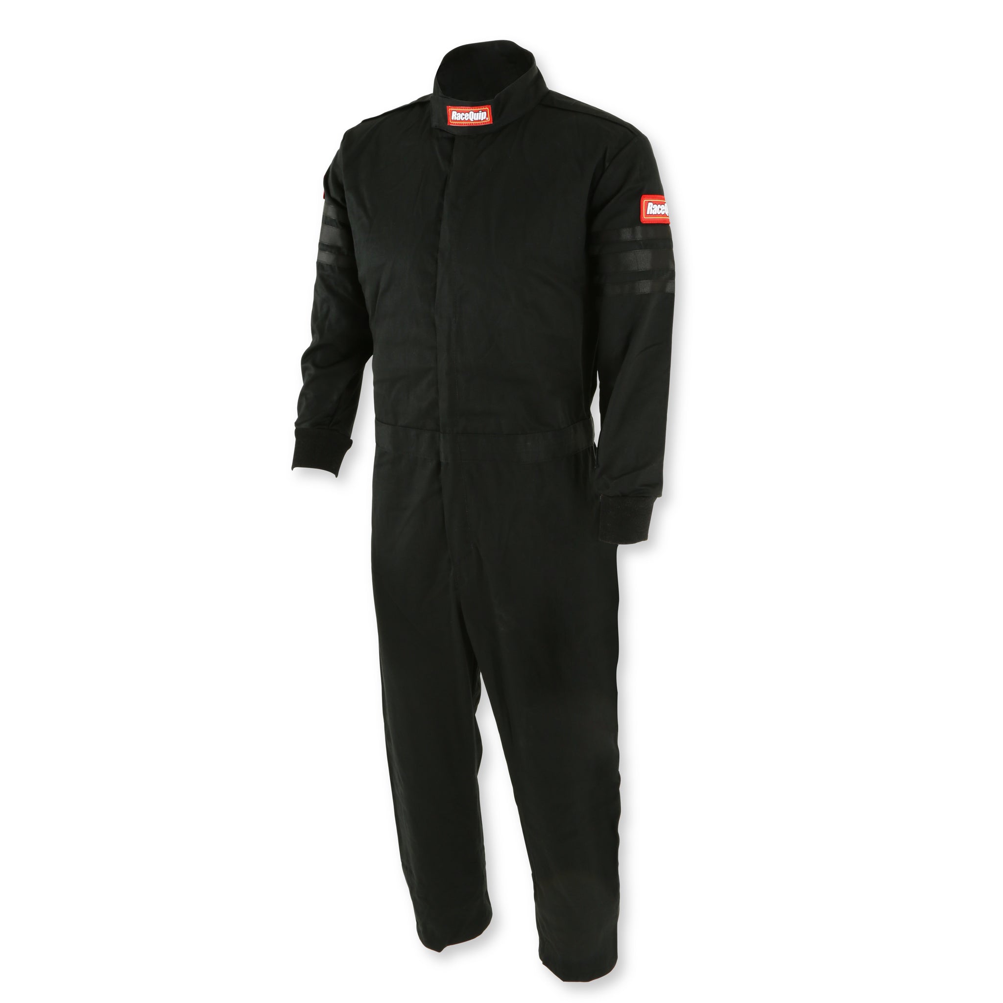 The RaceQuip Youth single-layer SFI-1 racing suit is made from Pyrovatex® FRC material. Note that sometimes these suits are referred to as "fireproof" racecar driver's suits, but actually all auto racing safety gear is "fire retardant". Pyrovatex® offers the maximum combination of overall flame and heat protection, durability and comfort for the price. This fire-retardant cotton based (FRC) material is used because it retains the softness and breathability of cotton and will wick away moisture from the skin. Pyrovatex® fabric is gentle and non-irritating to even the most sensitive skin. The treatment process leaves the exterior surface shiny and supple. Since the Pyrovatex® process combines a chemical agent with the raw cotton fibers to create a bond at the molecular level, with proper care, the suit will retain its flame-retardant properties beyond the useful life of the garment. All racing suits are assembled with heavy-duty, multi-needle, over-lock safety stitch machines to provide exceptional seam strength. RaceQuip suits feature a high-quality heavy duty Nomex® backed brass zipper installed with a double overlap for a more secure front opening. Stylish contrasting armband stripes match the full-length leg stripes.