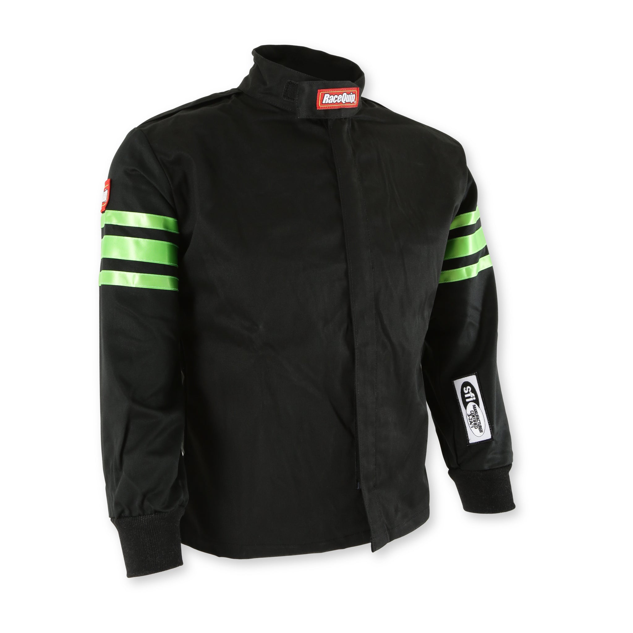 The RaceQuip Youth single-layer SFI-1 racing jacket is made from Pyrovatex® FRC material. Note that sometimes these suits are referred to as "fireproof" racecar driver's jackets, but actually all auto racing safety gear is "fire retardant". Pyrovatex® offers the maximum combination of overall flame and heat protection, durability and comfort for the price. This fire-retardant cotton based (FRC) material is used because it retains the softness and breathability of cotton and will wick away moisture from the skin. Pyrovatex® fabric is gentle and non-irritating to even the most sensitive skin. The treatment process leaves the exterior surface shiny and supple. Since the Pyrovatex® process combines a chemical agent with the raw cotton fibers to create a bond at the molecular level, with proper care, the suit will retain its flame-retardant properties beyond the useful life of the garment. All racing suits are assembled with heavy-duty, multi-needle, over-lock safety stitch machines to provide exceptional seam strength. RaceQuip jackets feature a high-quality heavy duty Nomex® backed brass zipper installed with a double overlap for a more secure front opening.
