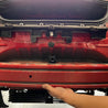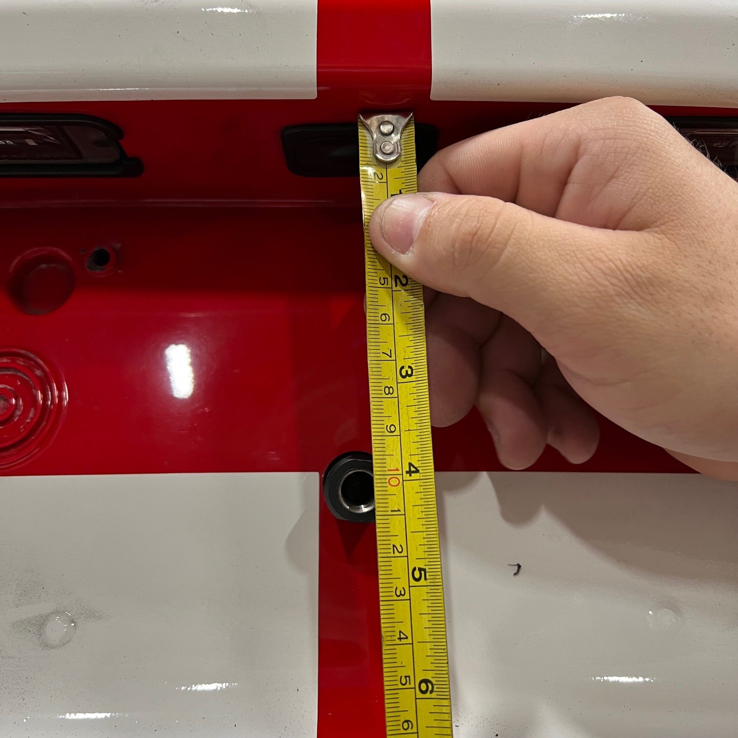 • This product threads into the front factory receiver already built into the car. Images show a modified tow hook door trimmed to fit our tow hook shaft.