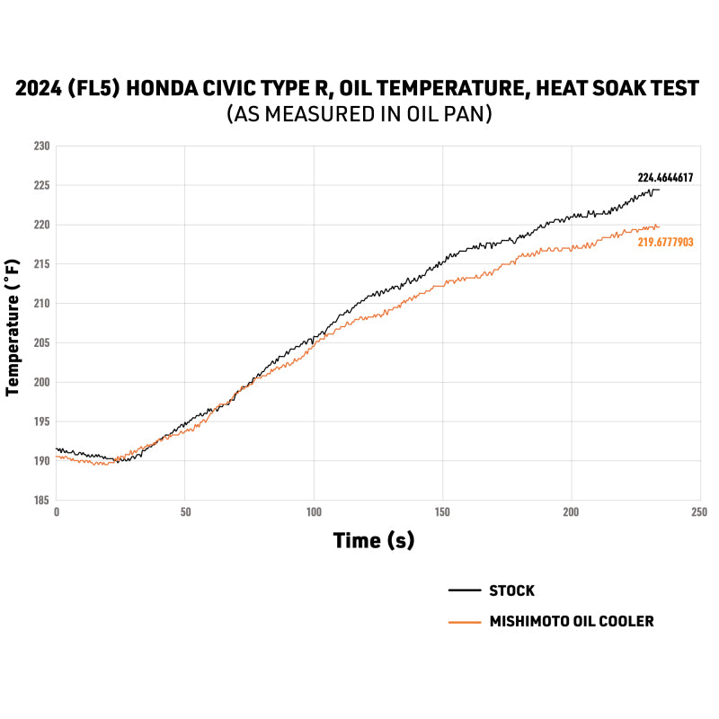 The 2023+ Honda Civic Type R is built to excel on the street or track, but even the most spirited drives can push engine oil to its limits. With the FL5 CTR's high-revving 2.0L turbocharged engine, extended hard driving can raise oil temperatures, risking performance and longevity. The Mishimoto Oil Cooler Kit for the 2023+ Honda Civic Type R is designed to keep oil temps in check while increasing system capacity, giving enthusiasts the confidence to push their Type R harder and longer.--Our oil cooler kit increases total oil capacity by 12% over stock and features a 19-row stacked plate cooler strategically positioned to receive maximum airflow. This cooler is also thermostatic to help bring oil up to optimal temperature for daily driving, and testing showed 5°F cooler oil temperatures compared to stock.--Installation is straightforward with all direct-fit components included. Black nylon oil lines connect seamlessly, and our billet oil line separator aligns hoses and keeps them securely fastened. The horn is relocated using the existing horn bracket, ensuring wiring harness integrity and maintaining horn position. High-temperature silicone and fiberglass sleeves are included to protect the stainless steel lines, and minimal trimming of a plastic trim piece is required to properly install the lines.--This kit combines performance, durability, and thoughtful design to maintain oil temperatures during spirited driving sessions. Backed by the Mishimoto Lifetime Warranty, the 2023+ Civic Type R Oil Cooler Kit provides a reliable solution for enthusiasts who want more cooling, more capacity, and more peace of mind behind the wheel.