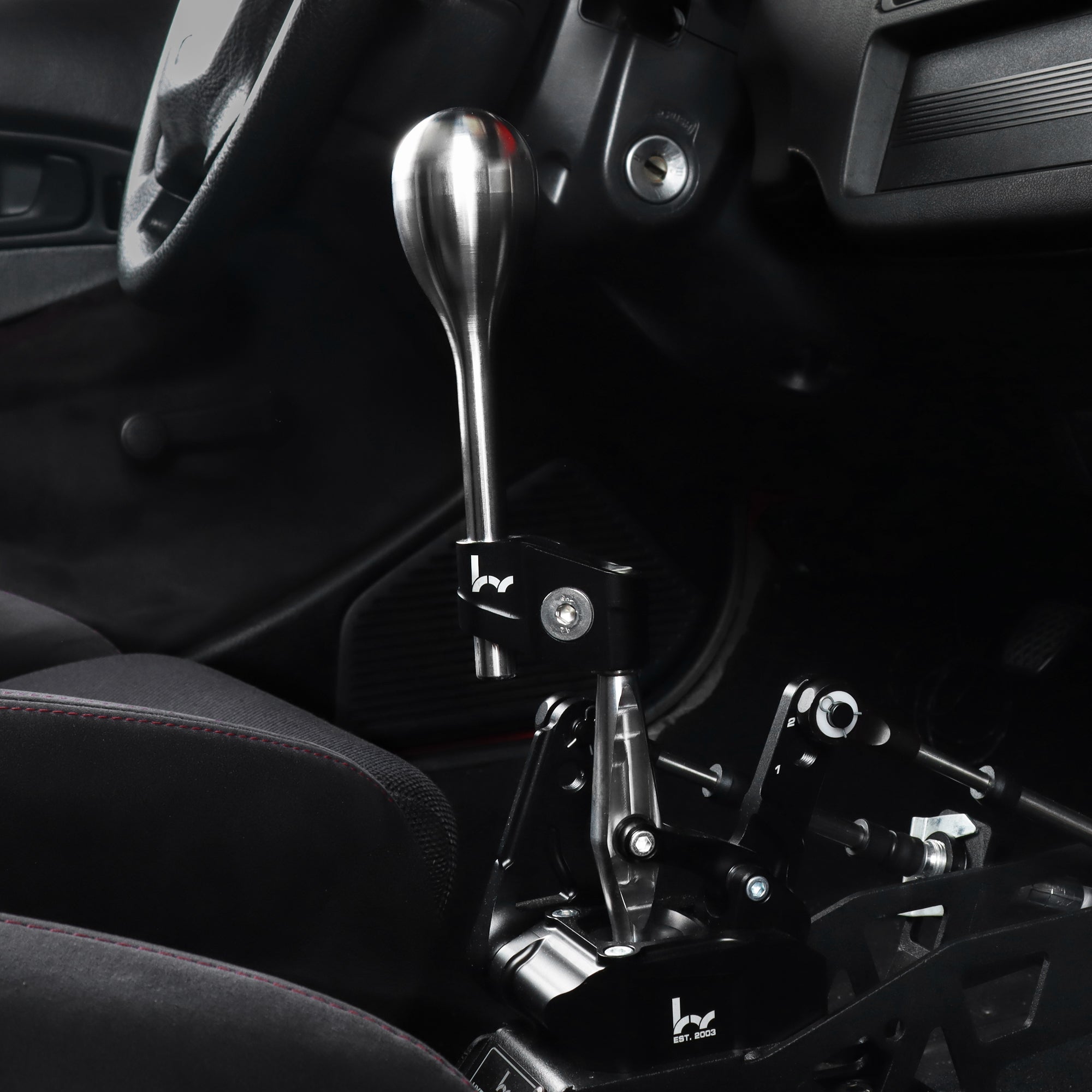 Never worry about your shift knob spinning while driving! Because of our innovative clamping shifter offset, the shift knob can be incorporated into the shift rod itself. You get a shift rod machined from one-piece billet stainless steel with a smooth ergonomic shape designed to fit all Hybrid Racing shifters.