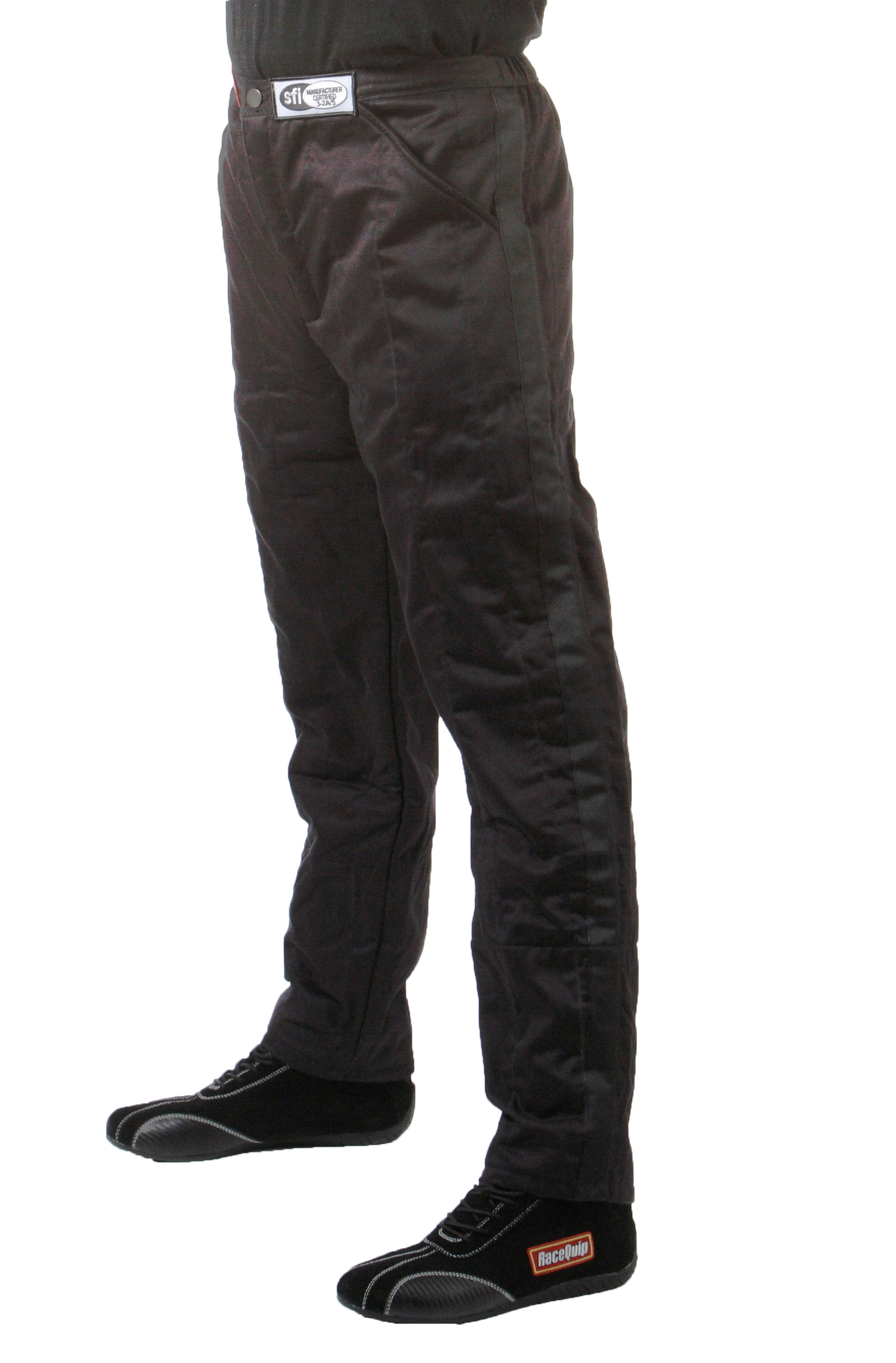 The RaceQuip 122 series multi-layer SFI-5 racecar driver's fire suit pants are made up of an outer layer of durable Pyrovatex® FRC, backed by a layer of Nomex®, then lined by another layer of Pyrovatex®. Note that sometimes these materials are referred to as "fireproof", but all auto racing safety gear is "fire retardant". Pyrovatex® offers the maximum combination of overall flame and heat protection, durability and comfort for the price. This fire-retardant cotton based (FRC) material is used for the inner and outer layers because it retains the softness and breathability of cotton and will wick away moisture from the skin. Pyrovatex® fabric is gentle and non-irritating to even the most sensitive skin. The treatment process leaves the exterior surface shiny and supple. Since the Pyrovatex® process combines a chemical agent with the raw cotton fibers to create a bond at the molecular level, with proper care; the pants will retain their flame-retardant properties beyond the useful life of the garment. The middle layer consists of Nomex(R) batting which is an inherently fire-retardant aramid fabric. All racing pants are assembled with heavy-duty, multi-needle, over-lock safety stitch machines to provide exceptional seam strength.