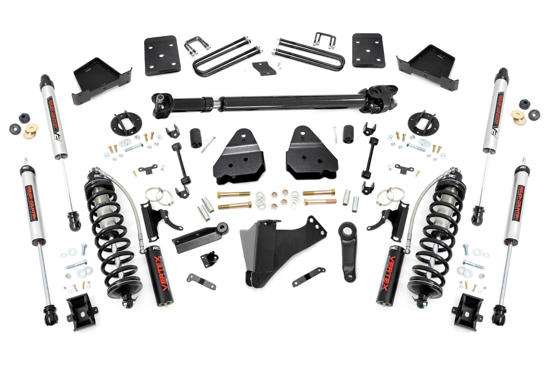 Explore New Heights. Give your fourth-generation Ford Super Duty superior lift height with Rough Country's 4.5-inch Coilover Suspension Lift Kit! This all-inclusive kit comes with everything you need for a total transformation of your truck. Run up to 35in tires while preserving the smooth, factory ride quality with this impressive upgrade.\Durable Components. When changing a vehicle's suspension, the key to preserving ride quality is keeping the geometry of all suspension components as close to their factory angles as possible. Rough Country's new 4.5-inch Suspension Lift features a set of ultra-durable radius arm drop brackets, precision fit to bolt right into the factory mounts for an easier install and a more factory-like angle. Utilizing this conversion kit you're removing the factory independent coil shock and coil set-up and replacing it with a massive 2.5in piston, nitrogen-charged, 8-stage adjustable Vertex Coilover. Rough Country’s Vertex Coilovers feature a monotube design with an external reservoir for increased oil capacity and damping sensitivity. When it comes to investing in a high-end kit, you’ll be pleased to find that Rough Country’s 2.5in piston design is beefier and offers an impressive 56% greater fluid capacity than the average reservoir shock. Each kit is paired with a monotube shock that provides optimal damping control.\Installation. Requiring cutting and drilling to install, an estimated timeframe of 6-10 hours is recommended to complete this full installation. This full kit can be installed at home and can be completed efficiently and quickly!\Limited Lifetime Replacement Warranty. Rough Country's 6-inch Coilover Suspension Lift Kit is backed with a limited lifetime replacement warranty towards manufacturer defects. As such, the product is protected from structural and workmanship damage after the date of purchase. With our industry-leading warranty give yourself peace of mind when using Rough Country's Suspension products!