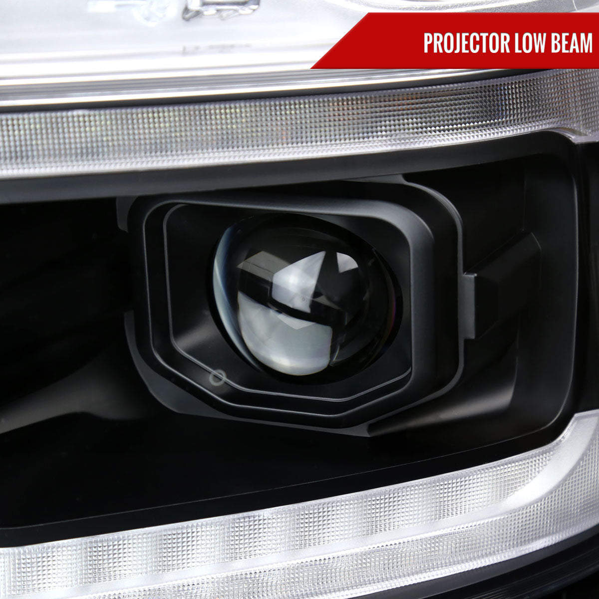 • Includes (1) pair of projector style headlights with switchback, sequential LED turn signal in matte black housing with clear lens