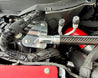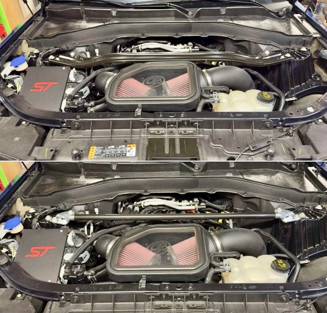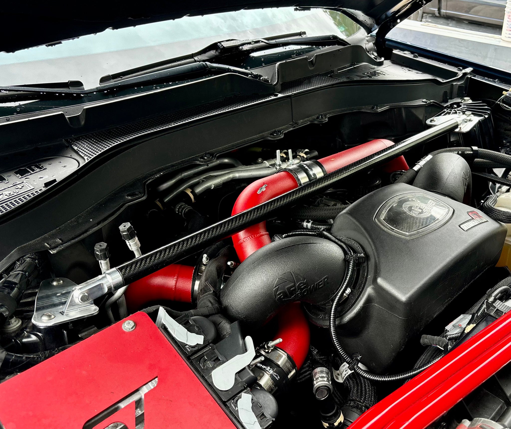 Our carbon fiber front strut tower brace is made in-house in the USA from genuine carbon fiber tubes that connect to CNC machined billet aluminum mounting plates and connectors, with quick release zinc-plated pins for easy removal.  Re-uses factory mounting hardware.