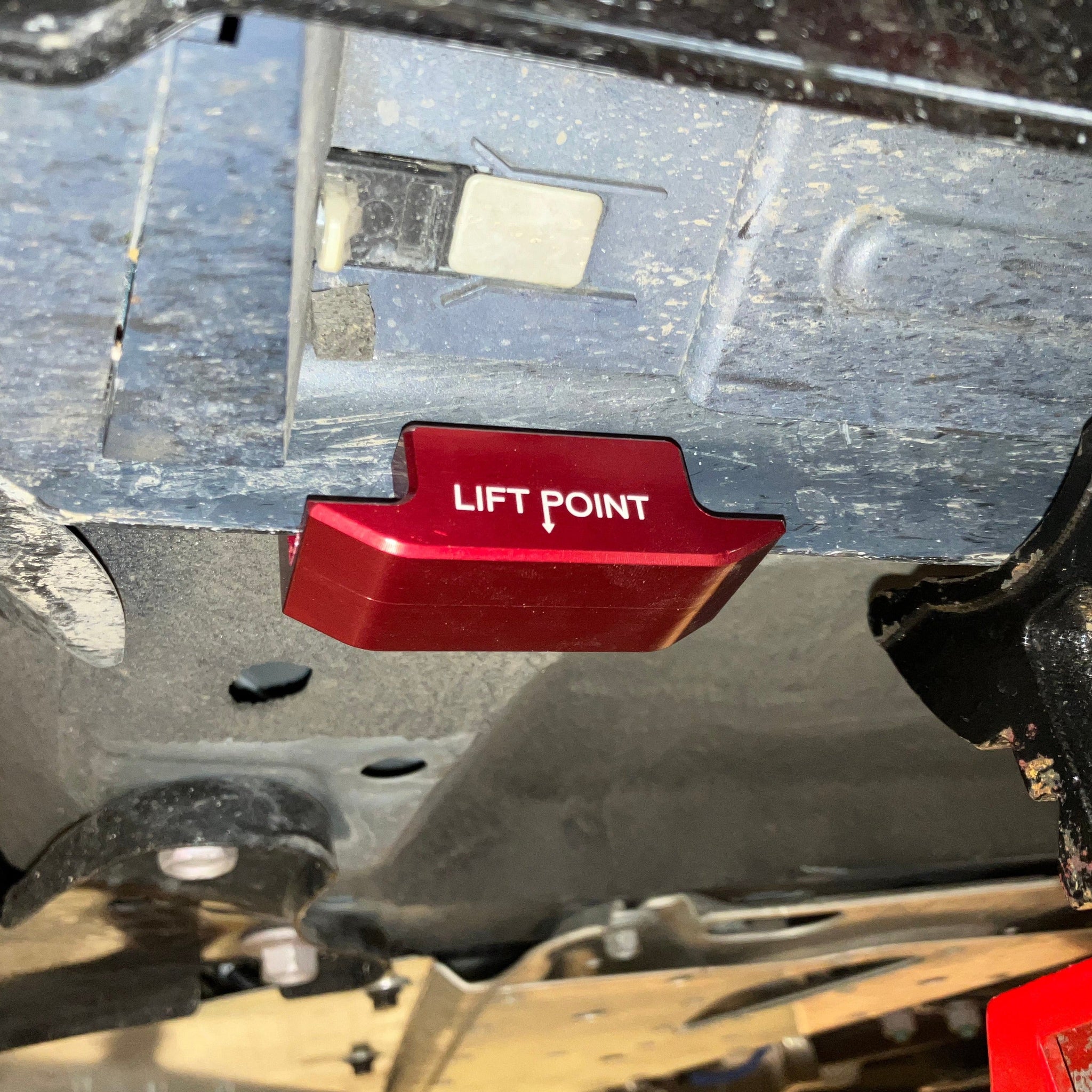 The original bolt-on lift points made in the USA for the 2016-2024 Miata MX-5. Machined from American billet aluminum and designed to be left on the car. The stealth design also incorporates weight savings and a custom design.  These are angled so as not to bend the pinch weld as the car is lifted by a floor jack or lift.