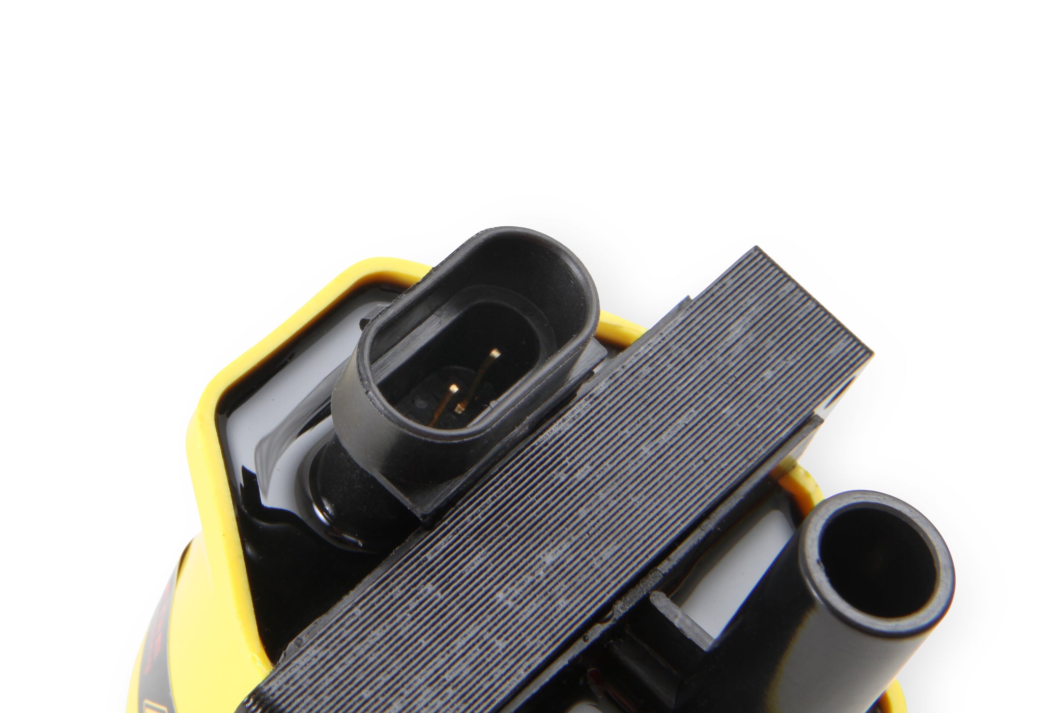 Engineered with optimized low resistance, high turns ratio windings around an M36 high silicone magnetic steel E-core for higher energy and voltage outputs. Results in quicker starts, improved idle quality, crisper throttle response and more high RPM power. Compatible with late model GM computer controlled remote mount HEI systems. Direct bolt-in, plug-in replacement. Can also work with CD ignition systems. Special high temperature epoxy resists shock and vibration, while increasing thermal conductivity. Brass coil wire contact increases energy transfer and resists corrosion better than aluminum. Comes complete with new mounting hardware. High dielectric strength ACCEL Yellow over molded housing. Output is 48,000 volts with 0.2 ohms resistance.