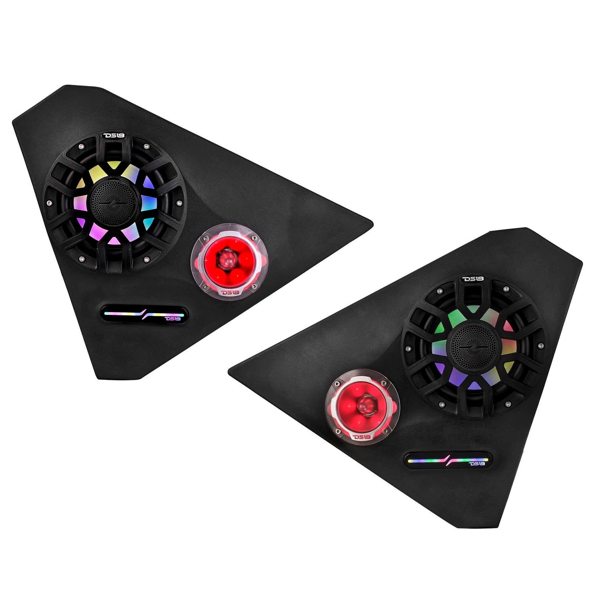 Designed to house most 6.5" DS18 speakers (PRO-SM6.2 Recommended) and 3.8" bullet tweeters (PRO-TW4L Recommended), these front kick panel pods significantly enhance your sound system performance. The sealed type waterproof enclosure and damping material ensure optimal speaker performance, delivering crisp highs and deep bass tones.