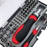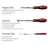 A SELECTION OF MOST USED BITS AND SOCKETS. The high-strength chrome vanadium steel bits are magnetized and hold firmly in the ratchets and bits. The carbon steel sockets are heat treated for hardness and torque, perfect to tackle multiple sizes and types of fasteners. The size of each socket is clearly engraved in the polished chrome-plated finish. The bits are stored upright for easy access.