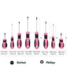 OUR SCREWDRIVER SET IS VERSATILE. We have chosen 8 of the most useful sizes for crafts and day-to-day do-it-yourself tasks around the home. Great to assemble furniture, install a TV stand, and everyday repairs and maintenance. This is the essential pink screwdriver set you need in your DIY toolbox.  We’ve included two 8” screwdrivers (Phillips #2 and slotted ¼”), two 7” screwdrivers (Phillips #1 and slotted 3/16”), two 6” screwdrivers (Phillips #0 and slotted 1/8” and two 3” stubby (Philips #2 and slotted ¼”).