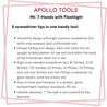APOLLO TOOLS’ PATENTED Mr. 7-Hands multi-screwdriver has a unique folding arm design. Each arm folds down and clicks as it is tucked within the body of the screwdriver when not in use, and clicks into an upright locked position for use.