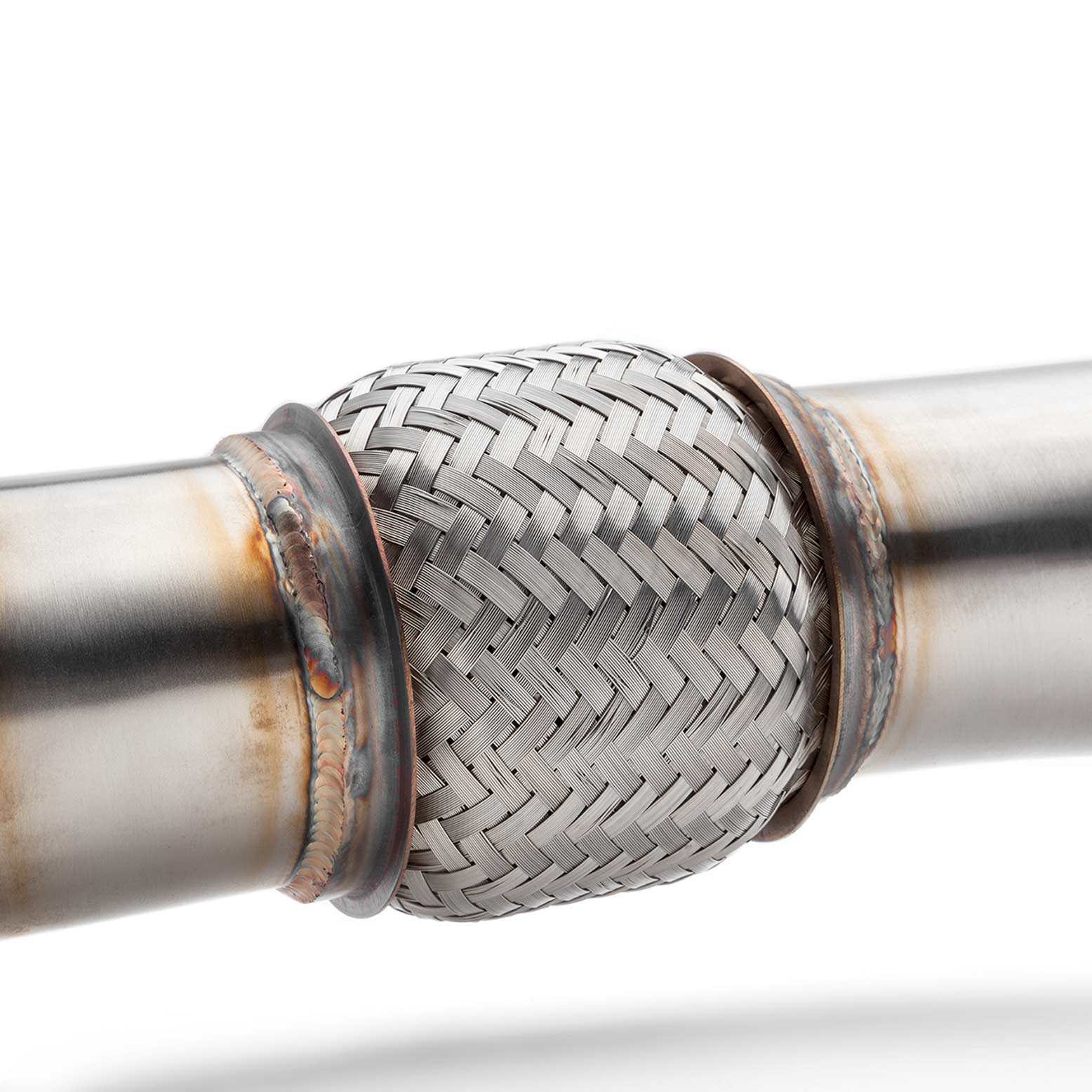 The entire system is constructed of 304 stainless steel and is meticulously TIG welded for outstanding appearance and durability. At the front, a high quality cast flange is machined to accept the factory donut gasket for leak-free installation. From there, 3" stainless steel tubing runs all of the way back to another 3" cast flange where it meets the y-pipe. A flex section in this pipe adds compliance to the system.