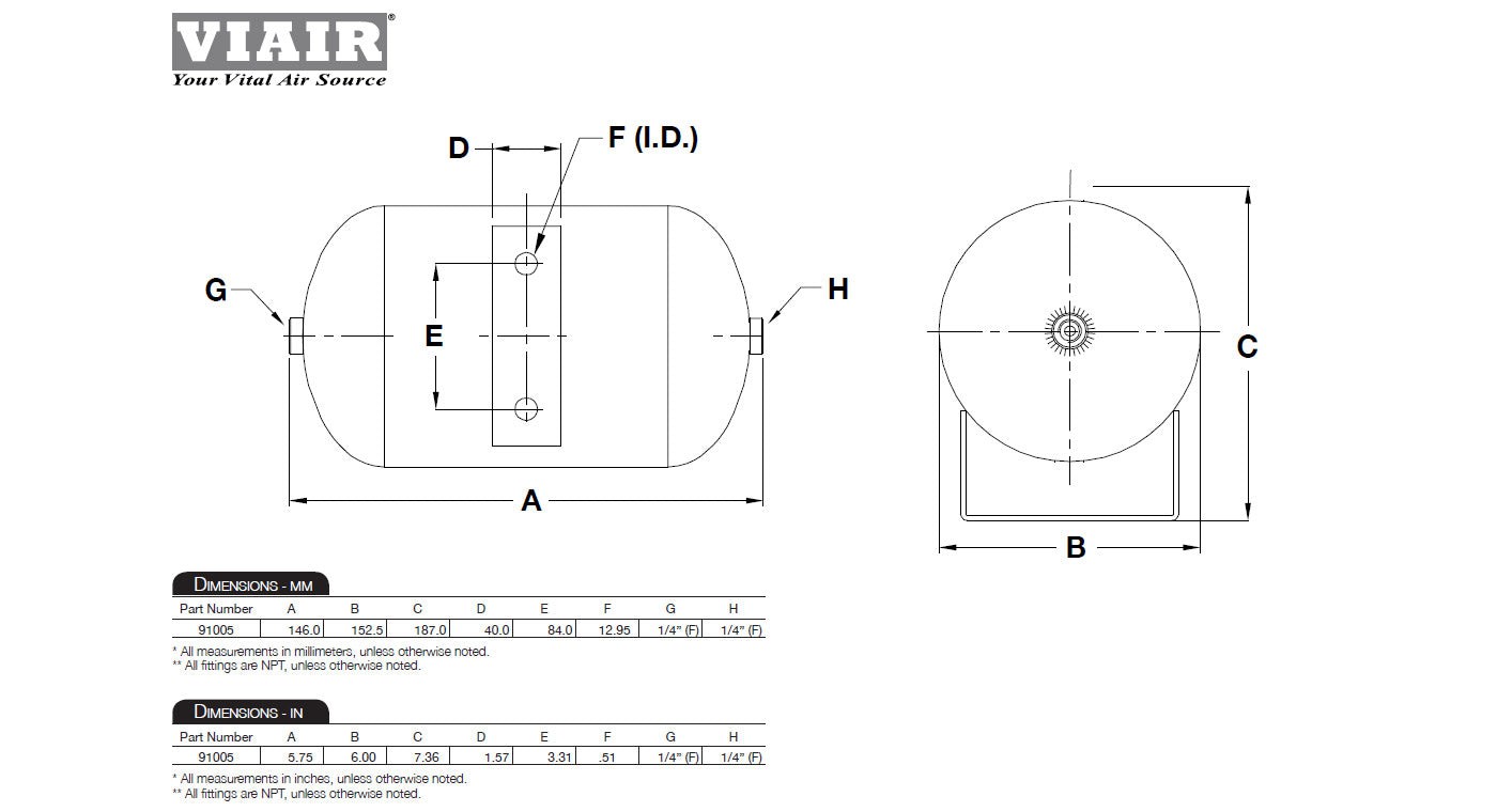 Check out the Viair 2-port half-gallon air tank, a finely-welded tank with a 1/4" port on each side and an anti-corrosion coating. Rated for up to 150 PSI, it's ideal for smaller pneumatic applications.