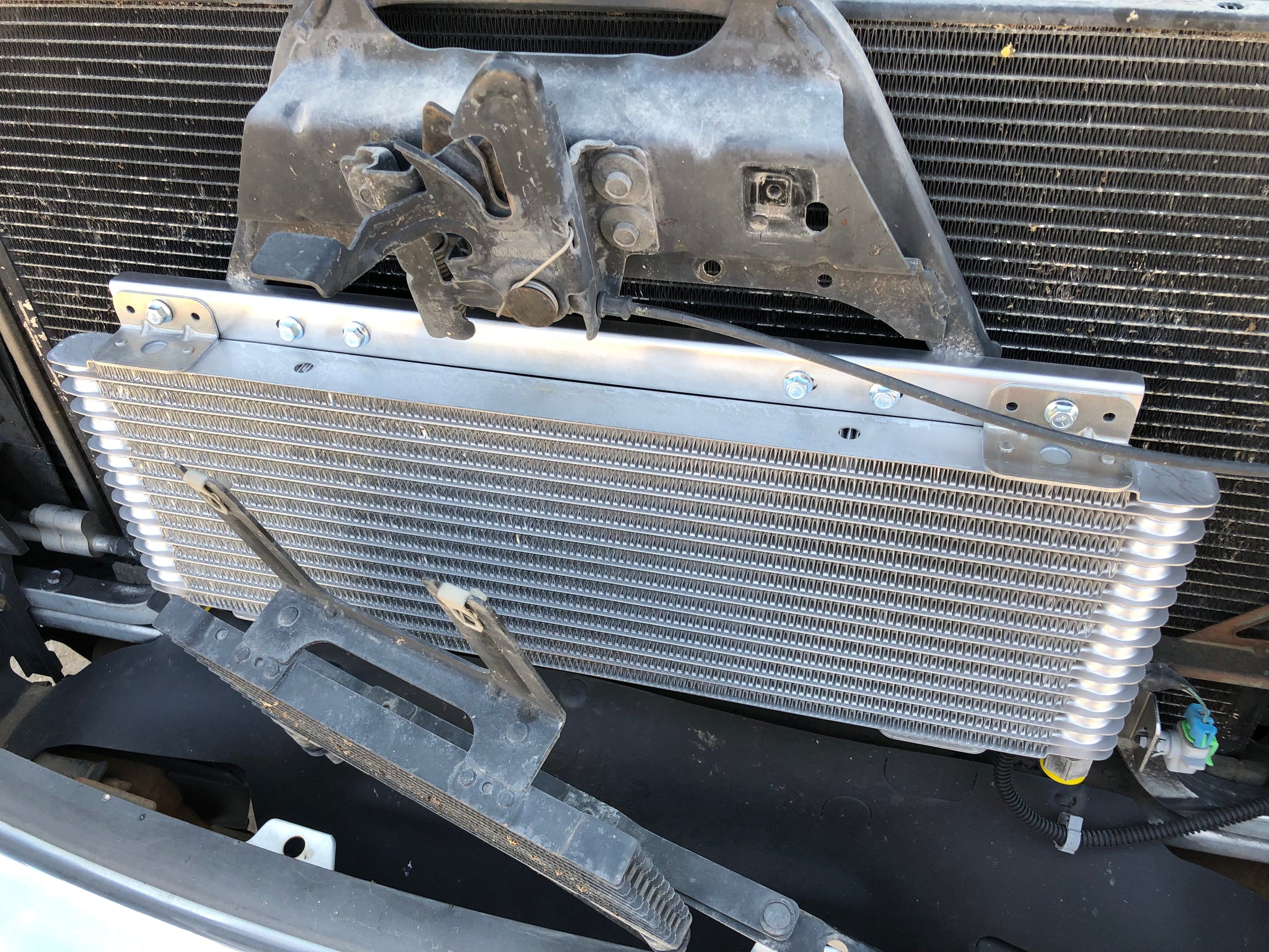 This bracket is the easiest and cleanest way to install your transmission cooler. No drilling or self-tapping screws are needed, it simply bolts in place. There is even a provision for the ambient air temperature sensor. Bracket is made from 5032-H32 aluminum. This bracket cannot be used in conjunction with our dual fan kits.