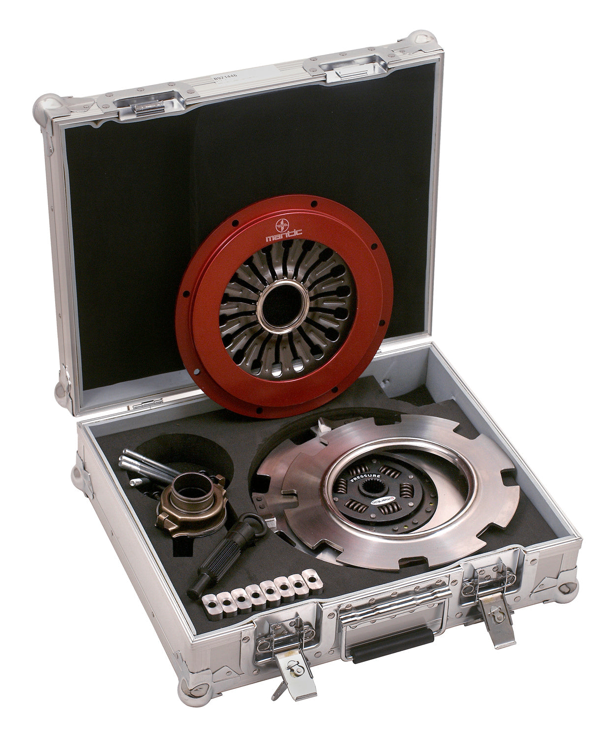 Our Mantic Clutch kit uses the unique sprung center with cushioned twin disc design. This equates to more torque capacity and heat resistance while retaining excellent drivability. The Mantic twin disc clutches also use 9" diameter discs that greatly reduces the MOI (Moment of Inertia). This allows more power to the ground as well as quicker more precise shifts. The lightweight flywheel revs quicker compared to the heavier OE flywheels.The billet red cover and supporting components are machined from billet stock adding strength and durability. Billet will not flex under heavy load like the typical weaker stamped steel kits.