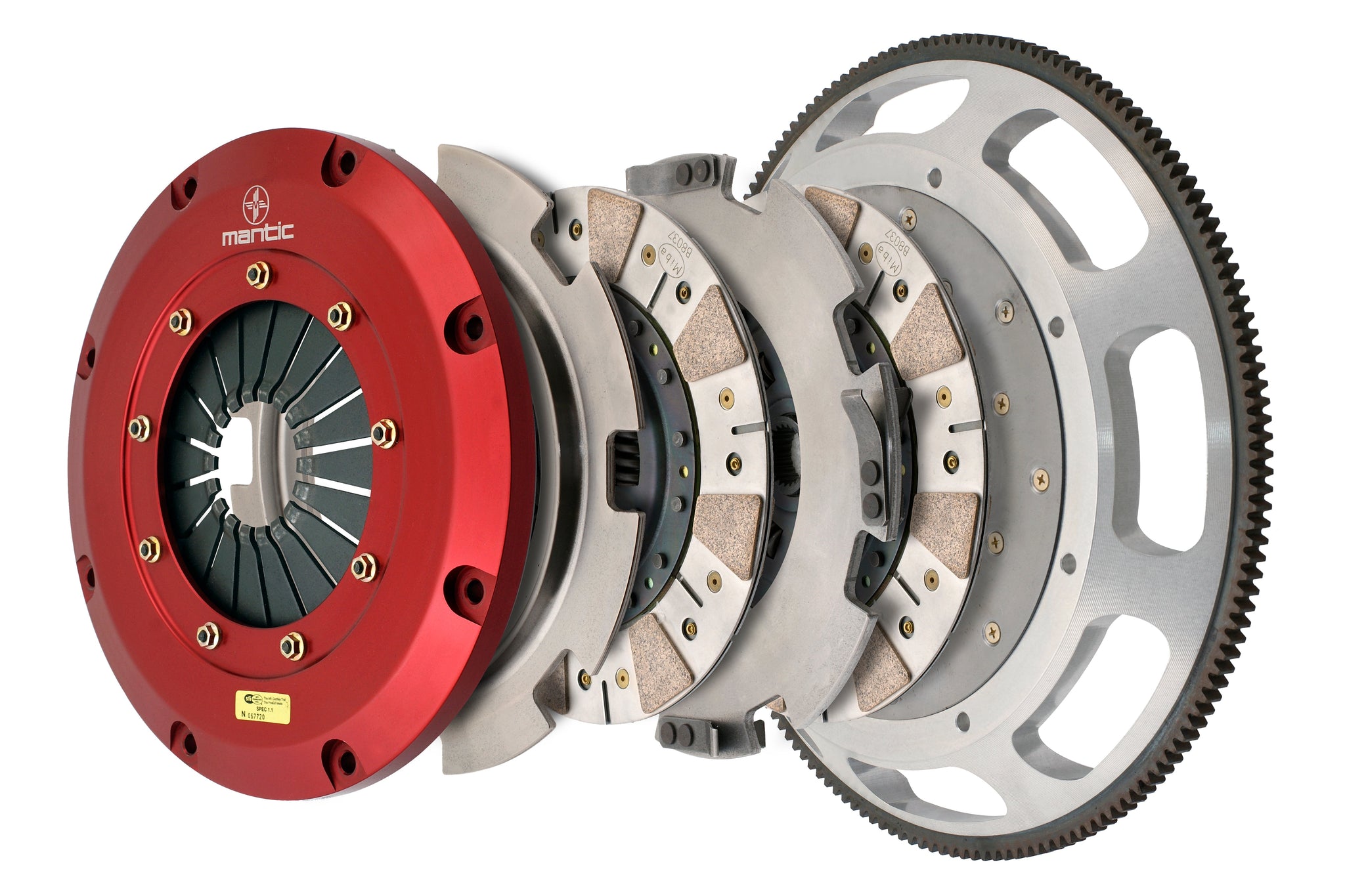 Our Mantic Clutch kit uses the unique sprung center with cushioned twin disc design. This equates to more torque capacity and heat resistance while retaining excellent drivability. The Mantic twin disc clutches also use 9" diameter discs that greatly reduces the MOI (Moment of Inertia). This allows more power to the ground as well as quicker more precise shifts. The lightweight flywheel revs quicker compared to the heavier OE flywheels. The billet red cover and supporting components are machined from billet stock adding strength and durability. Billet will not flex under heavy load like the typical weaker stamped steel kits.