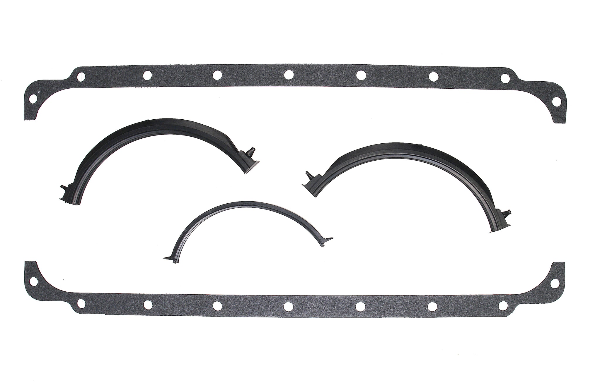 Manufactured from cellulose/nitrile composition gasket material. A black latex rubber coating is applied to outside of gasket to help seal minor oil pan rail irregularities and eliminate the possibility of oil leakage. Provides excellent sealing and durability. Complete with molded rubber front/rear oil pan seals where applicable. For original equipment replacement, high performance street, drag race and oval track.