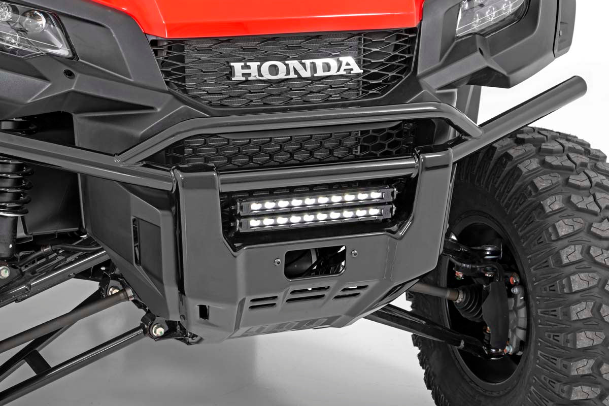 COMMAND THE DARK with Rough Country’s 10-inch Slimline LED Bumper Kit for Honda Pioneer 1000 models. This handy solution includes everything you need to upgrade your Pioneer with a single or dual Rough Country 10-inch LED light bar mounted into the factory bumper for outstanding illumination. \Choose between a single or dual LED configuration for the look and output you desire. Each light can be pitched upward, downward, or straight ahead to illuminate however you see fit. \Whether you’re off the beaten path at sunset or gathering all your gear before dawn, you’ll be glad to have access to this additional lighting power to tackle the task at hand. With up to 8,000 lumens and 100 watts of high-intensity CREE LED output, you’re sure to have plenty of LED power.\These all-weather lights feature a durable, IP67 Waterproof, die-cast aluminum housing and include a premium wiring harness with toggle switch and in-line fuse. Best of all, this easy-to-install kit features a 100% bolt-on installation procedure allowing you to upgrade your side by side quickly and easily! Don’t miss this opportunity to upgrade your UTV with one of the best Honda Pioneer LED accessories available!