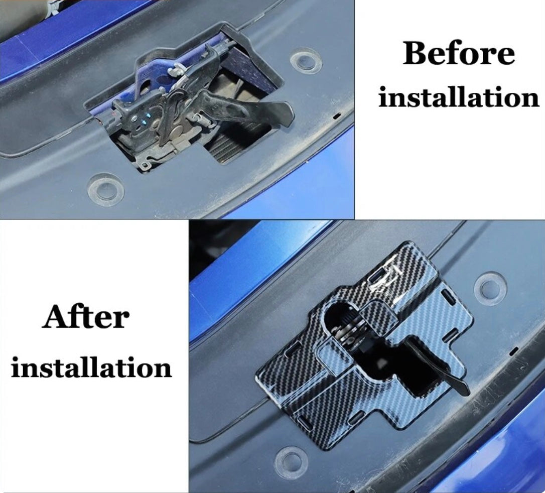 This carbon fiber print hood latch cover installs over the open space in the engine bay.