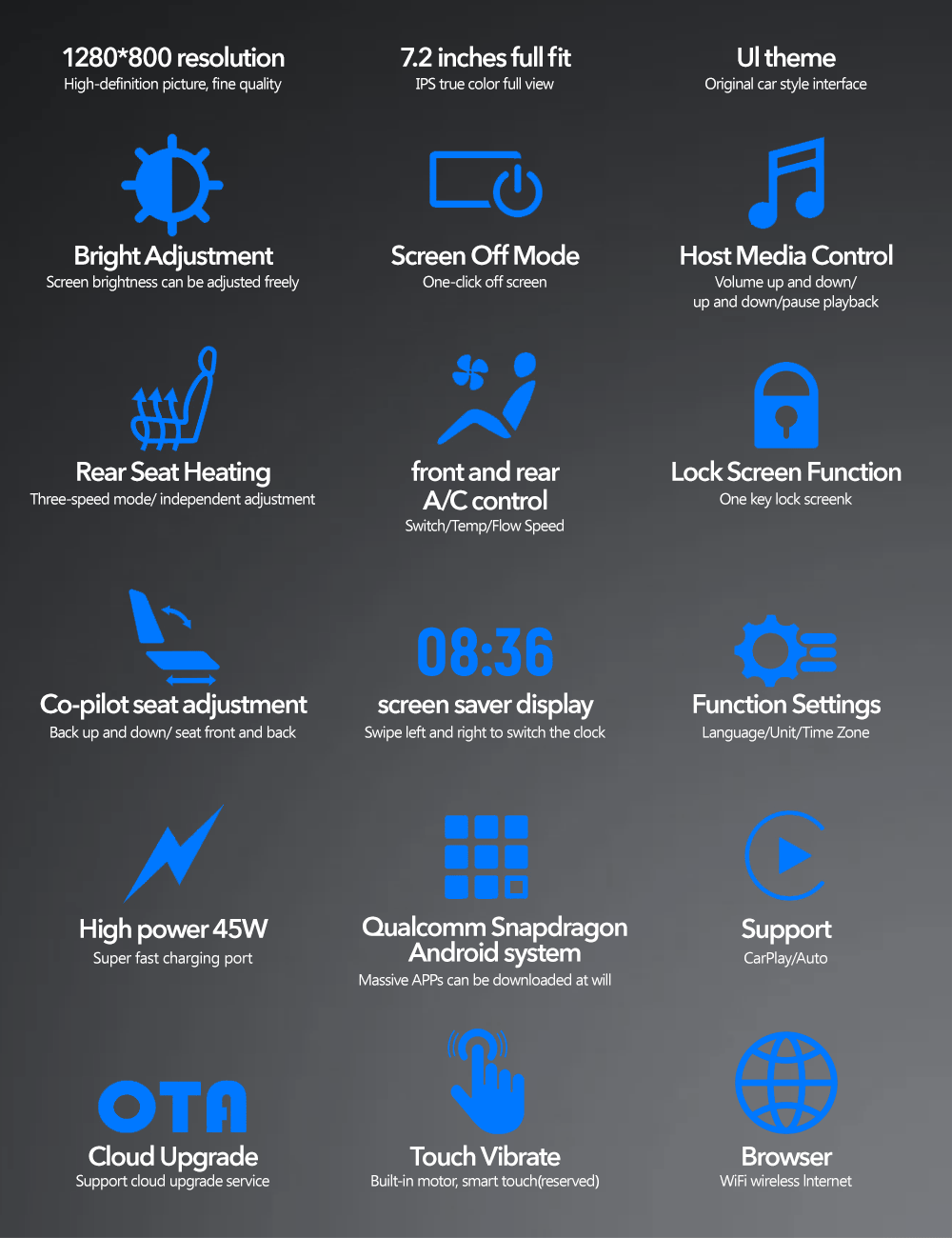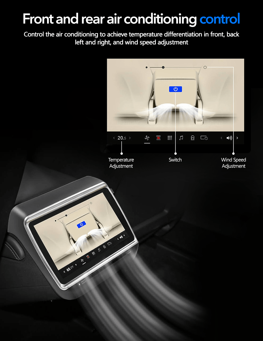 Rear air conditioner, temperature adjustment by zone; seat heating, rear control; seat massage, relieve fatigue; adjustment function; control the volume of the front host unit up and down; network HD TV to watch live broadcast at any time; Android system, free download; dynamic air conditioning UI , high-end technology; can insert SIM card, U disk playback, plug and play; interact with the main screen; supports 4G network and WIFI Internet access.
