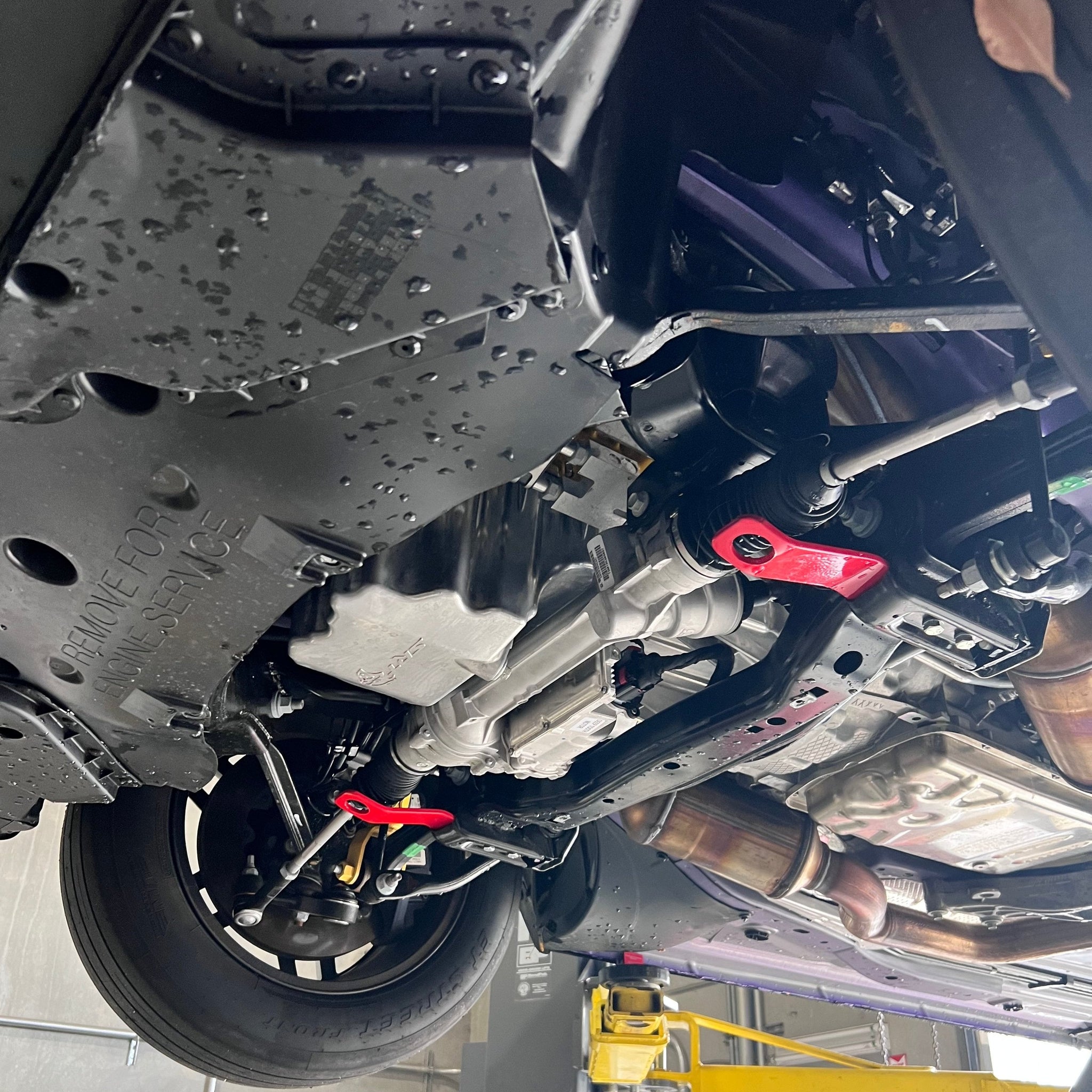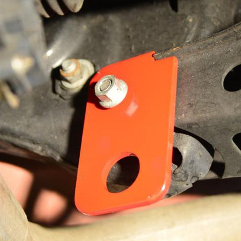 Strap your 09-23 Dodge Challenger down to your trailer quickly, safely and easier than ever! Avoid using your lower control arms or chassis main brace or your wheels. This product can also be used as a DYNO strap point.