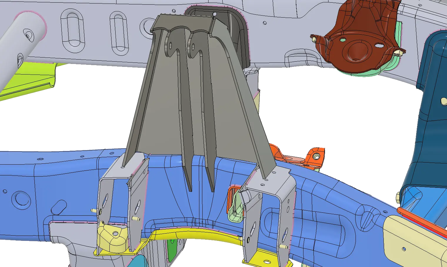 Welds onto the frame tabbing off the upper control arm mounts.