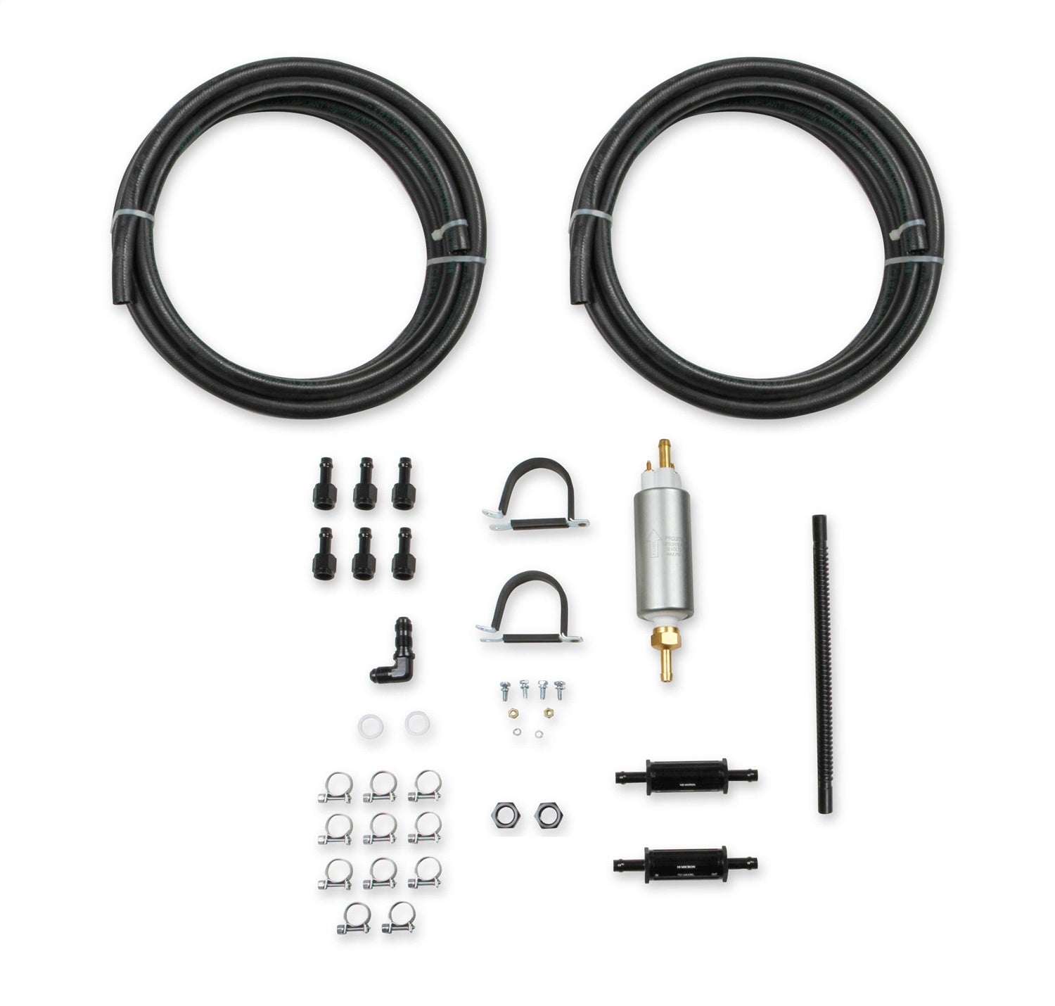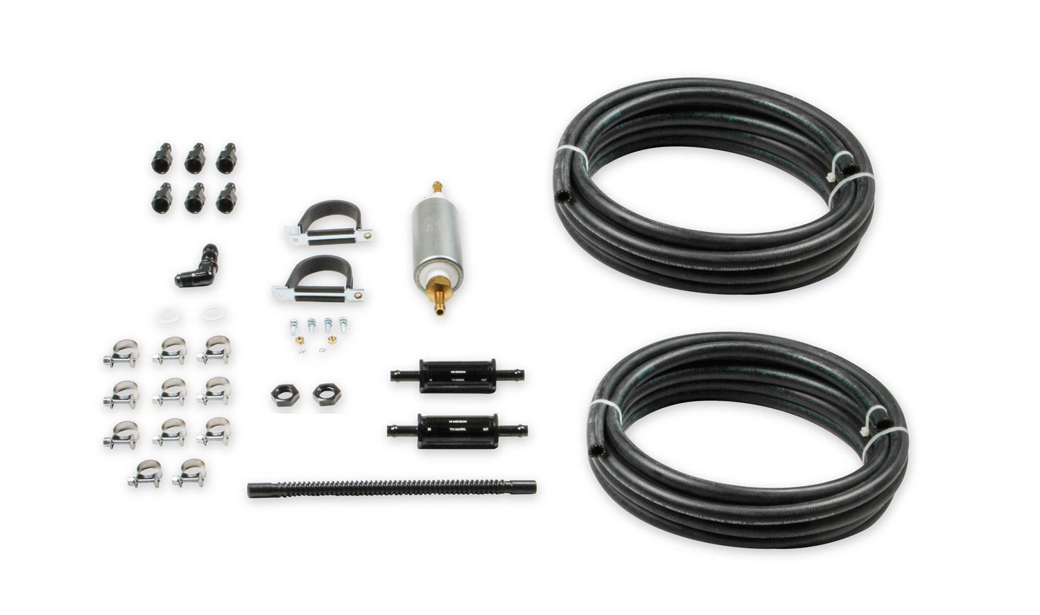 Earl's Vapor Guard™ fuel system plumbing kits are designed to replace the old fuel system when converting from a carburetor to Electronic Fuel Injection (EFI). The Vapor Guard hose is compatible with modern fuels and is ideal for use with pump gas, race gas, and ethanol blended gasoline. This kit includes 40' of 3/8" EFI Vapor Guard hose (suitable for most Return-Style fuel systems). This fuel system kit includes the electric fuel pump, Vapor Guard fuel hose, billet fuel filters, hose ends & hardware.