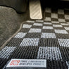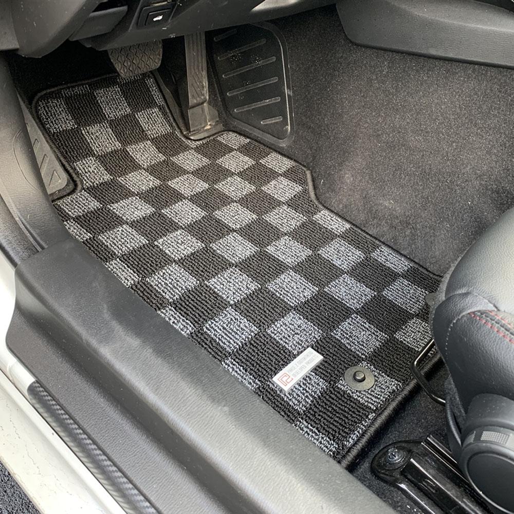 P2M MAZDA ND MIATA 2016+ / FIAT 124 race floor carpet mat set with race inspired checkered pattern in dark grey coloring.