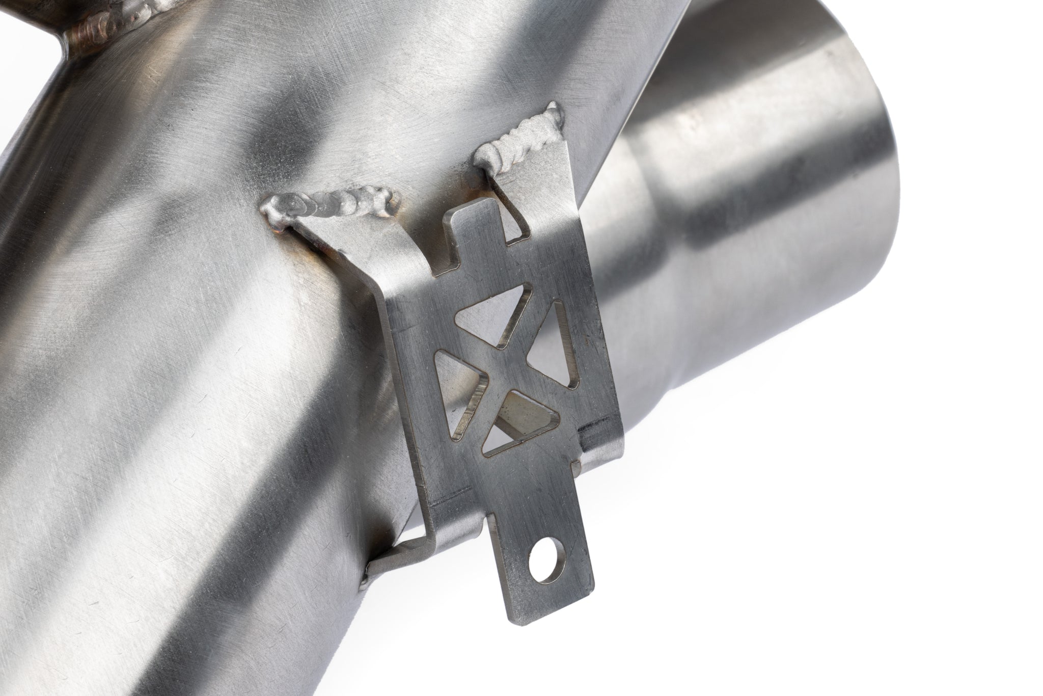 Our premium catback exhaust system for the Porsche 911 (992) is a full T304 stainless steel system with quad exits. It features dual 3" & 2" exhaust paths that creates an exhaust note that's sure to turn heads! The cross sectional area on the non-valved paths are 66% larger than stock, and the valved paths are 19% larger. Yet despite this, the system weighs 37% lighter than the upgrade Porsche Sport Exhaust (PSE)! The short valved paths let the system scream at wide open throttle with minimal backpressure and maximum exhaust velocity through the system, which is exactly what a turbocharged engine wants. And when cruising, the valves close, allowing the system to act civilized with enough growl to let you know it's there. Of course everything in the system is high quality. All tubing is brushed T304 stainless steel with mandrel bends and TIG welding throughout. The exhaust valves are cast and feature premium components. The mounting brackets are CNC-bent and CNC-laser cut for a precision fit. All this makes for a premium system that's simple to install, is larger than stock, weighs less than stock, and sounds amazing in every scenario.