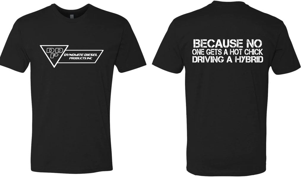 This is our popular 'Because no one gets a hot chick driving a hybrid' shirt design.