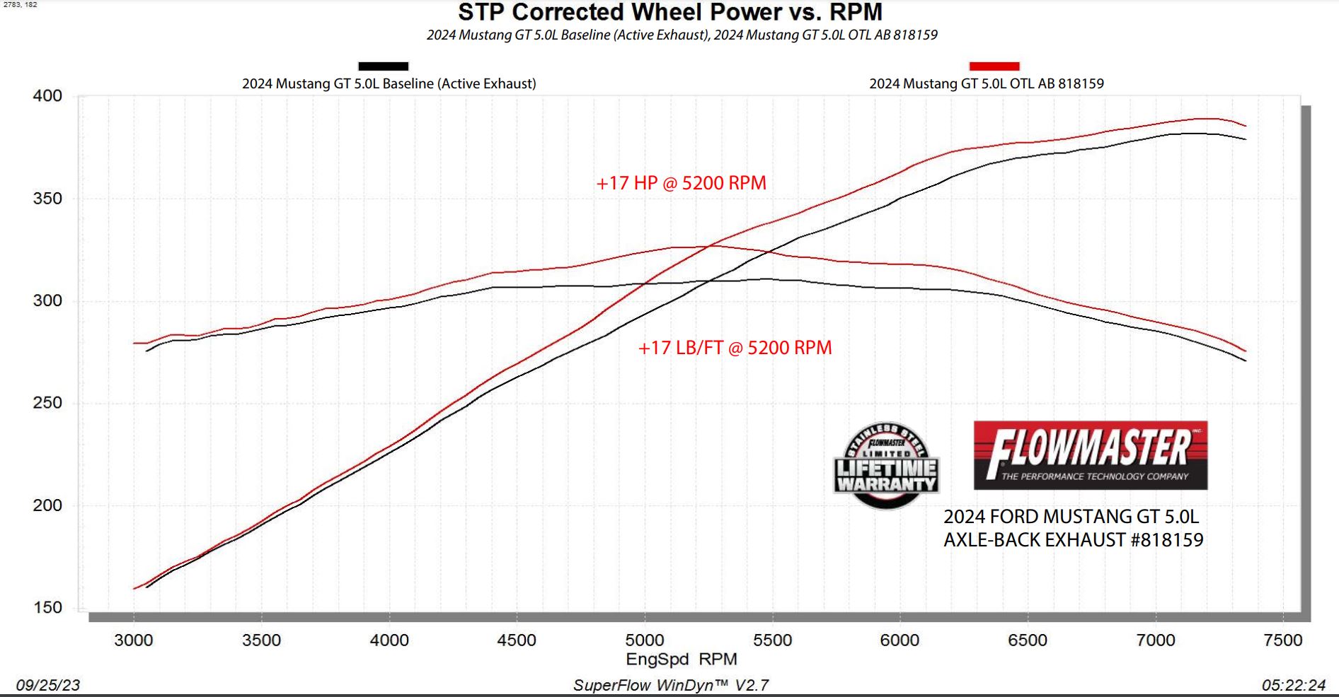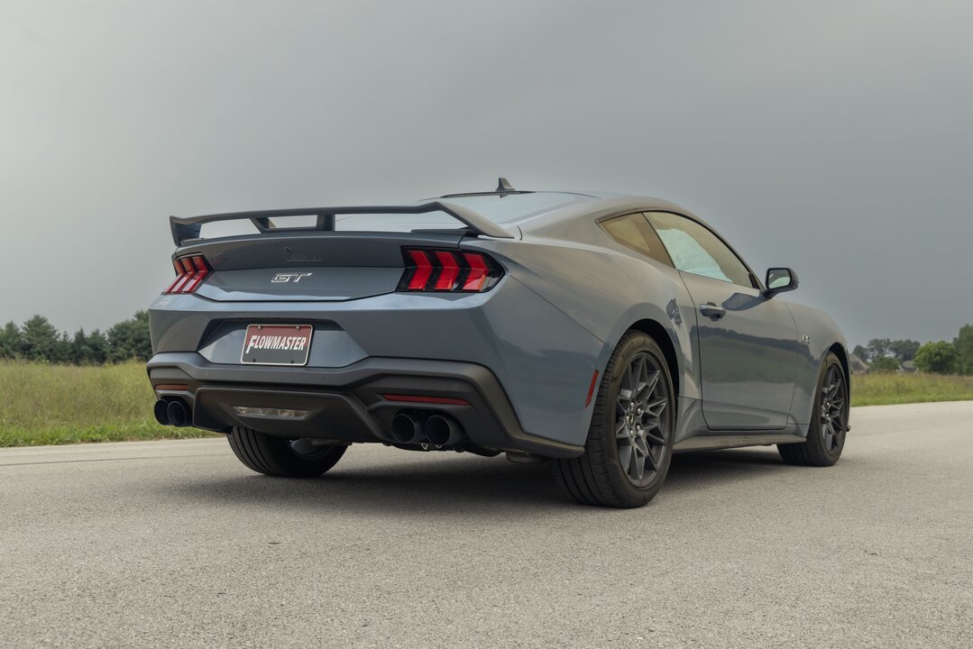 Flowmaster introduces our Outlaw Axle-back exhaust system for the 2024-2025 Ford Mustang GT with the 5.0-liter engine or EcoBoost 2.3-liter engine and the factory performance exhaust option. This system uses the Outlaw style mufflers for an aggressive exhaust tone and increased performance. Maximum dyno gains of up to 17 hp and 17 lb-ft were measured at the rear wheels. 3.00-inch mandrel bent 409 stainless steel tubing is used to maximize exhaust flow and durability. Quad 4.00-inch black ceramic coated tips are used to add a custom look to this iconic vehicle. All of the necessary hardware is included and factory mounting locations are used for an easy installation. Fits both coupes and convertibles. Backed by Flowmaster's Lifetime Limited Warranty.