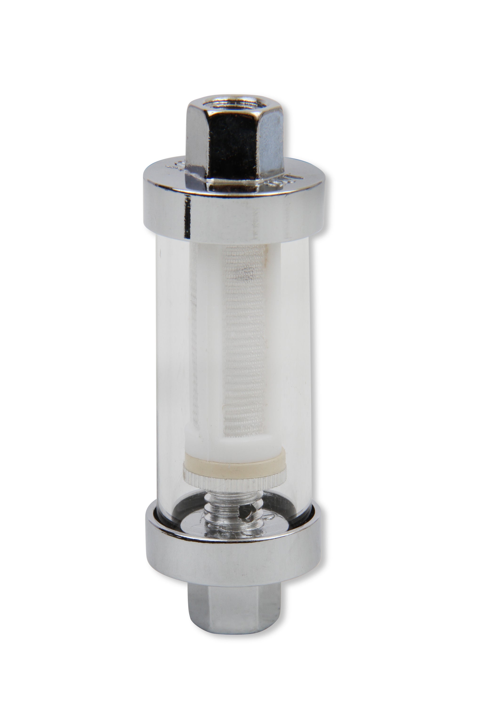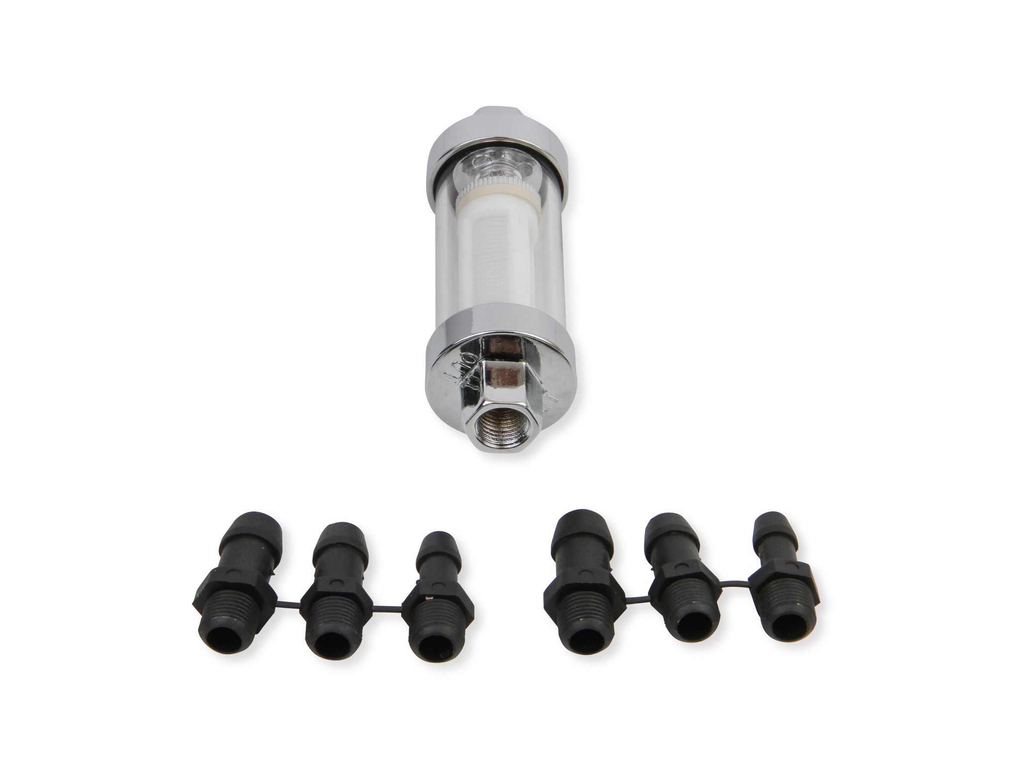 The Mr. Gasket Clearview Fuel Filter Kit has chrome ends and a glass body for clear and quick viewing of fuel flow and debris trapped in the 100 Micron white mesh replaceable filter element. Supports up to 400 horsepower. Includes 1/4 inch, 5/16 inch, and 3/8 inch hose barb fittings.