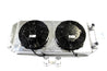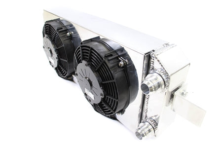 The PLM Power Driven Aluminum Tucked Radiator offers unmatched value with versatile threaded inlet and outlet fittings for AN or clamp-on hoses, and adjustable, non-welded mounting brackets for universal fitment, maximizing engine space by tucking the radiator underneath the support.