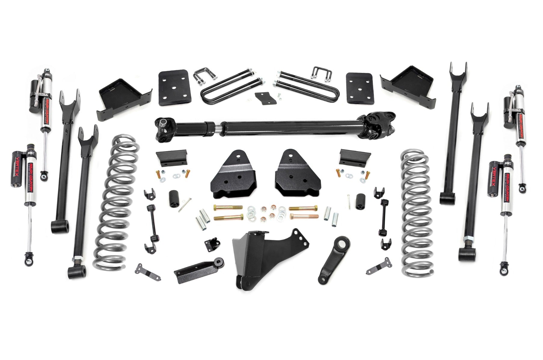Gain greater travel and improved handling while adding ground clearance and aggressive style with Rough CountryΓÇÖs 4-Link F-250 Lift Kit.This innovative kit allows you to replace your factory arms with a 4-Link setup, using Rough CountryΓÇÖs durable, fixed upper arms and adjustable lower control arms. A set of radius arm drop brackets maintain proper geometry and allow for proper caster setting, which is crucial to maintain factory handling.This kit includes a set of lifted coil springs, radius arm drop-brackets, and ultra-durable, fabricated Anti-wrap rear blocks that prevent binding and axle wrap. This kit also includes stainless steel extended brake lines and brake line brackets to ensure you have everything you need to install your lift. Best of all, this kit features Rough CountryΓÇÖs Nitrogen-Charged N2.0 Shock Absorbers for the ultimate balance in off-road performance and a smooth highway ride. Includes Rough CountryΓÇÖs Lifetime Replacement Warranty