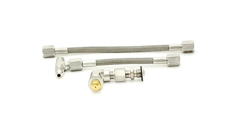 Stainless steel hose, ends, elbow, T, check valve, washers, and adapters. Select nozzle size