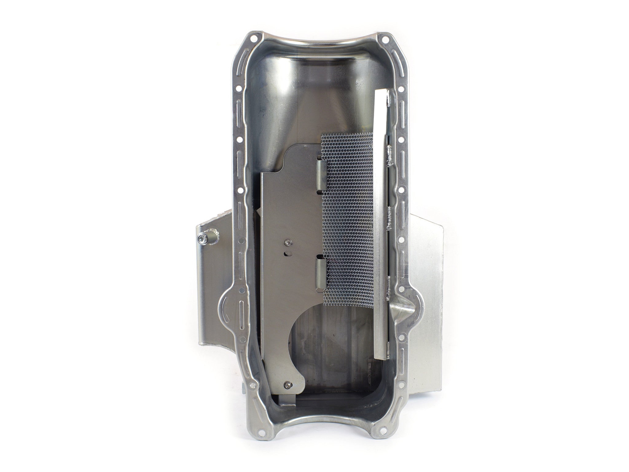 This Competition wet sump is for '86 and newer Small Block Chevys with one piece seals. Fits front steer chassis with both aftermarket and Camaro front ends, others when the engine is moved. It has a 7" deep, 15" wide, 12" long sump, and an 8 quart system capacity. Will work with all starter and flywheel combinations. Requires one of our pickups.