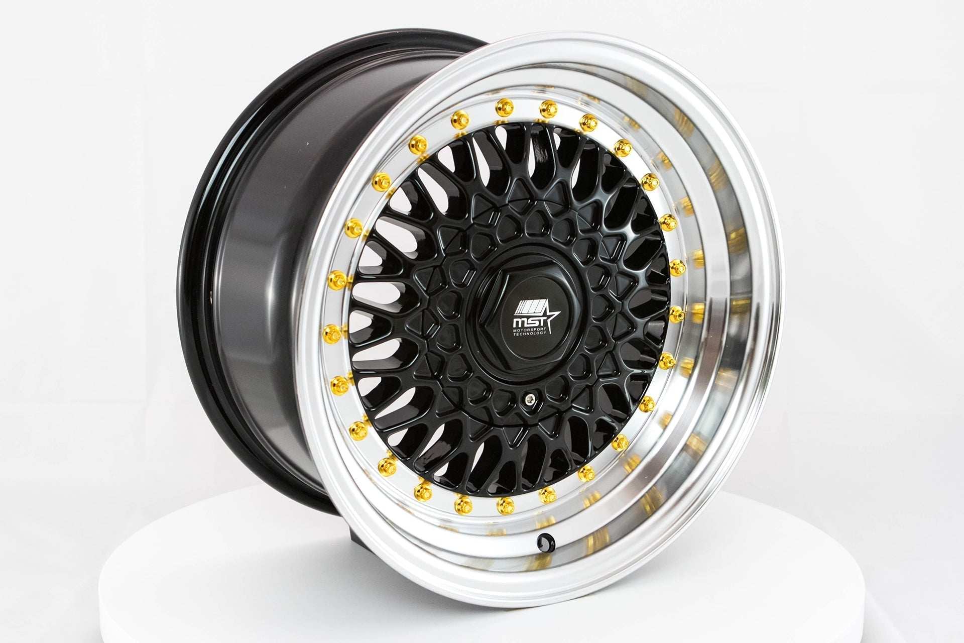MST Wheels MT13 Black w/ Machined Lip and Gold Rivets 15x8 | 4x100/4x114.3 (13-5816-20-BKGL)