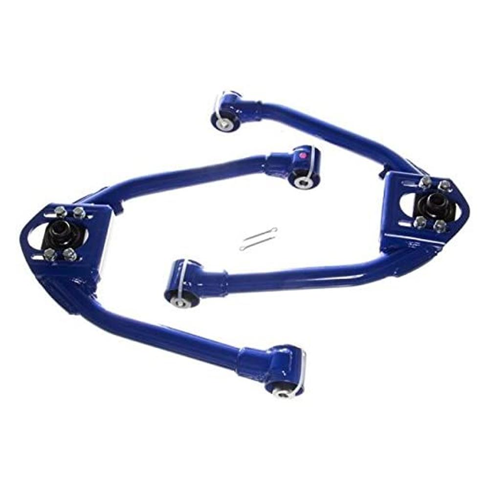 P2M Z33 350Z/G35 front upper control arms are constructed from high strength S45C steel alloy. Unlike other cars, the 350Z once lowered required negative camber adjustment. These FUCA were designed for this type of adjustment (negative camber adjustment only). Having the correct camber dialed in is crucial for the life of your tires and also vehicle handling performance. Arms comes with thick powder coated blue finish for rust prevention.