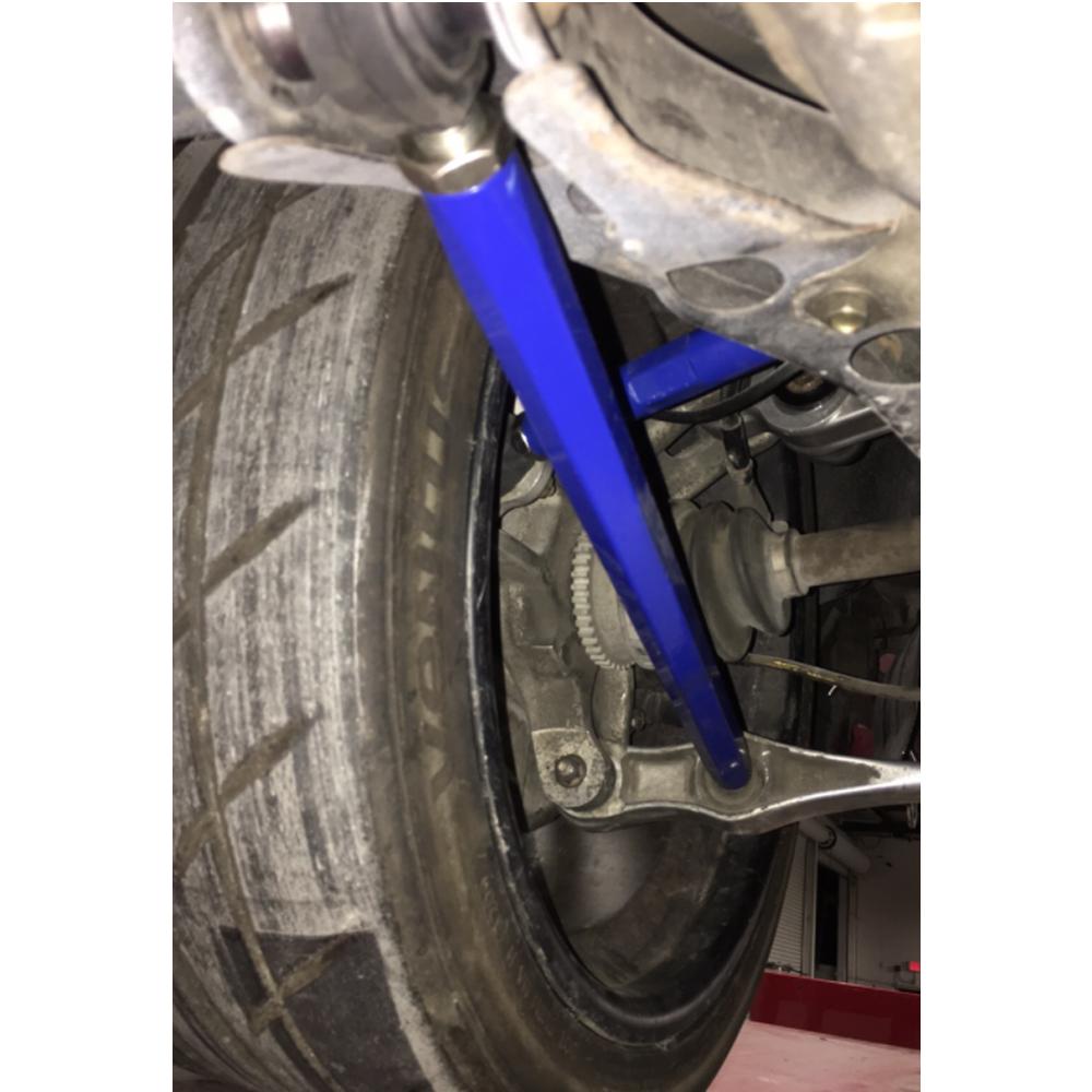 P2M rear trailing links for the Mazda FD3S RX7 allow the adjustment of Caster in the rear wheels which can drastically effect the responsiveness of the car during hard cornering or drifting. Made from S45C heavy duty steel tubing and 3pcs teflon lined pillow ball ends (insulated) replace the OEM soft-rubber bushings which improves durability and transfer energy to the rear wheels much more efficiently.