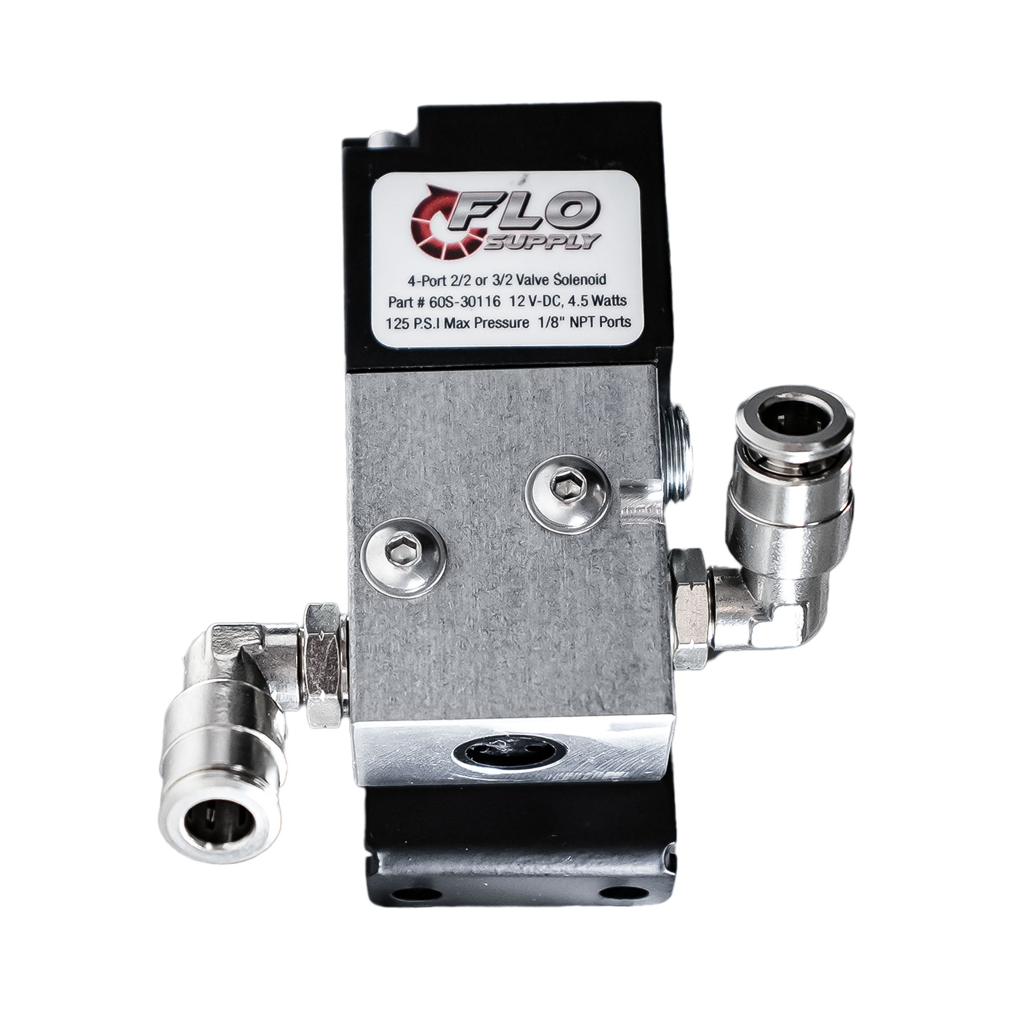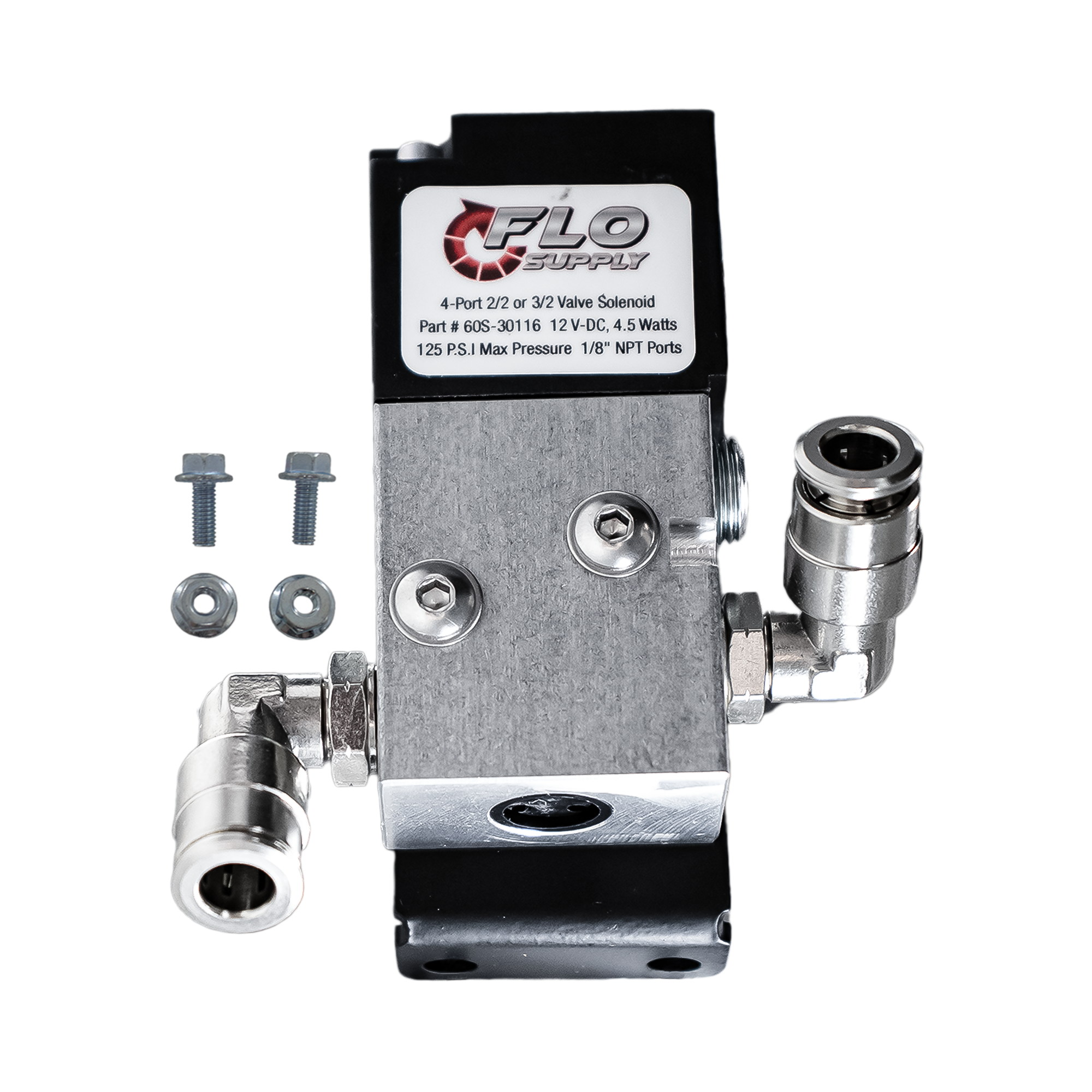Take control of your pneumatic or fluid systems with the complete Flo Supply 4 Port Solenoid Valve Kit. This all-in-one package brings together our high-performance solenoid valve, precision-machined bracket, and the required fittings for seamless system integration—perfect for high-speed automotive applications like shifter and parachute control.